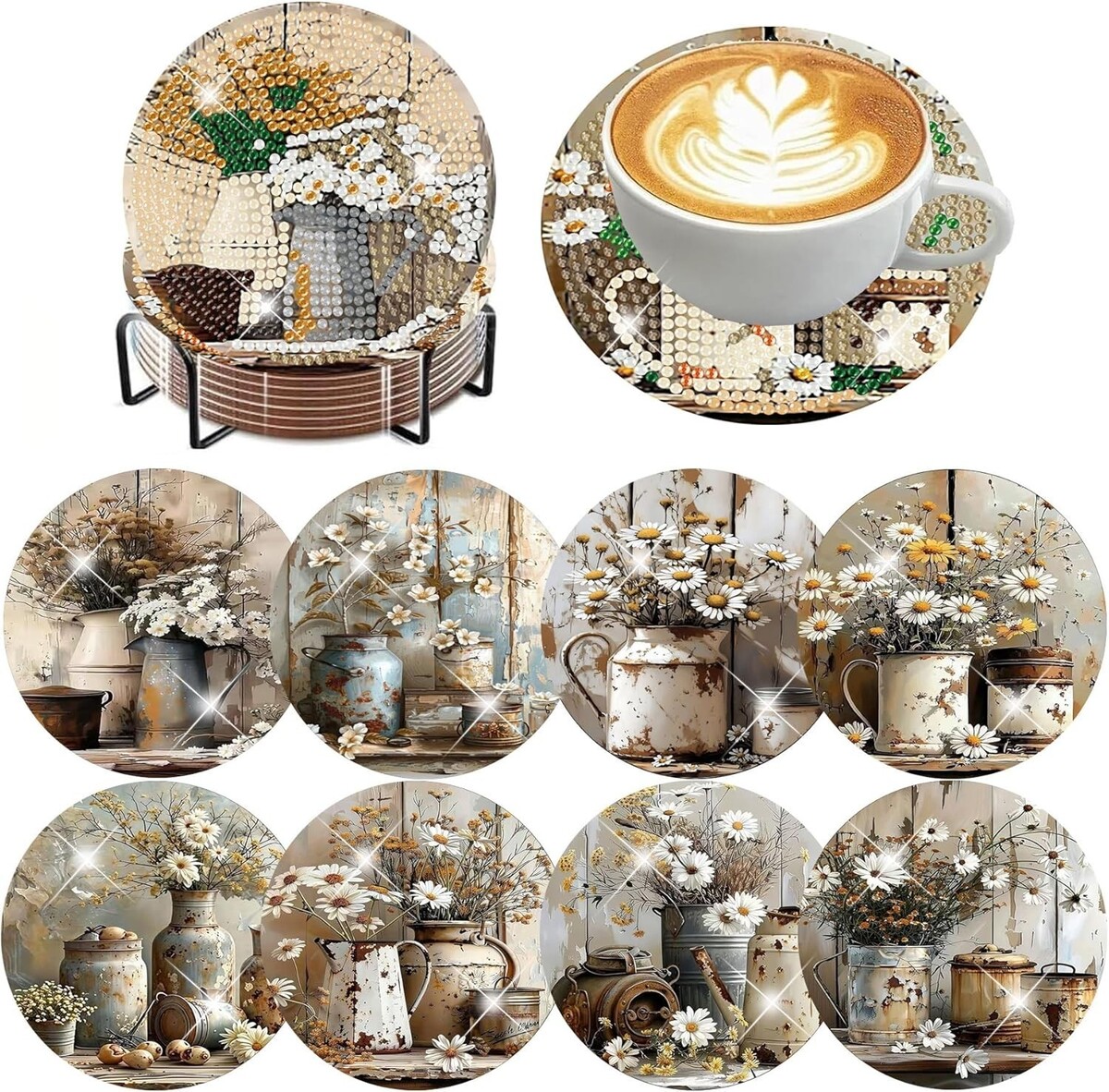 8 Rustic Farmhouse Daisy Diamond Paintings Coasters