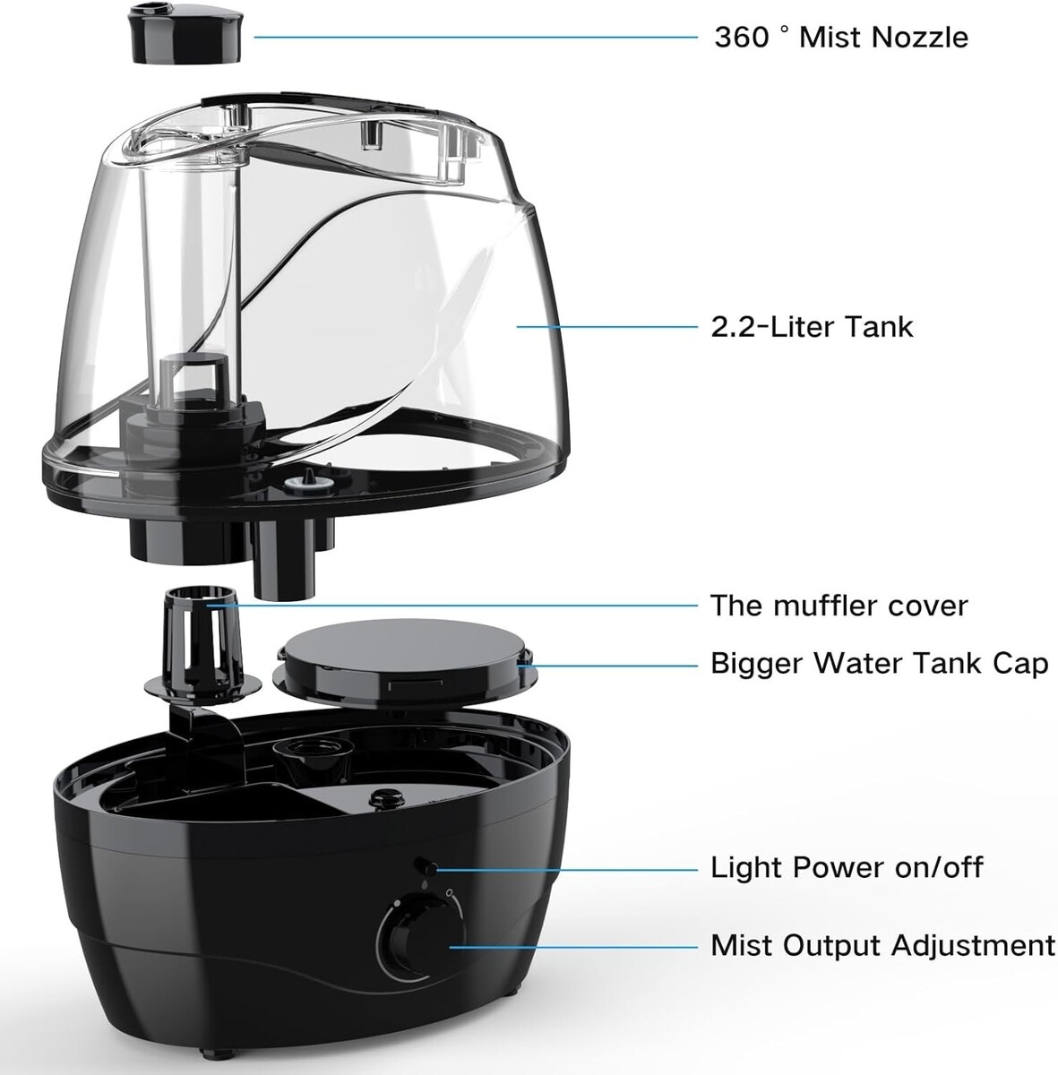 Features: Quiet Operation,Whisper-Quiet Operation,Night Light Function,BPA Free,Auto Shut Off,Knob Adjustment Switch,Low Water Indicator,Easy Operation,Visible Water Tank