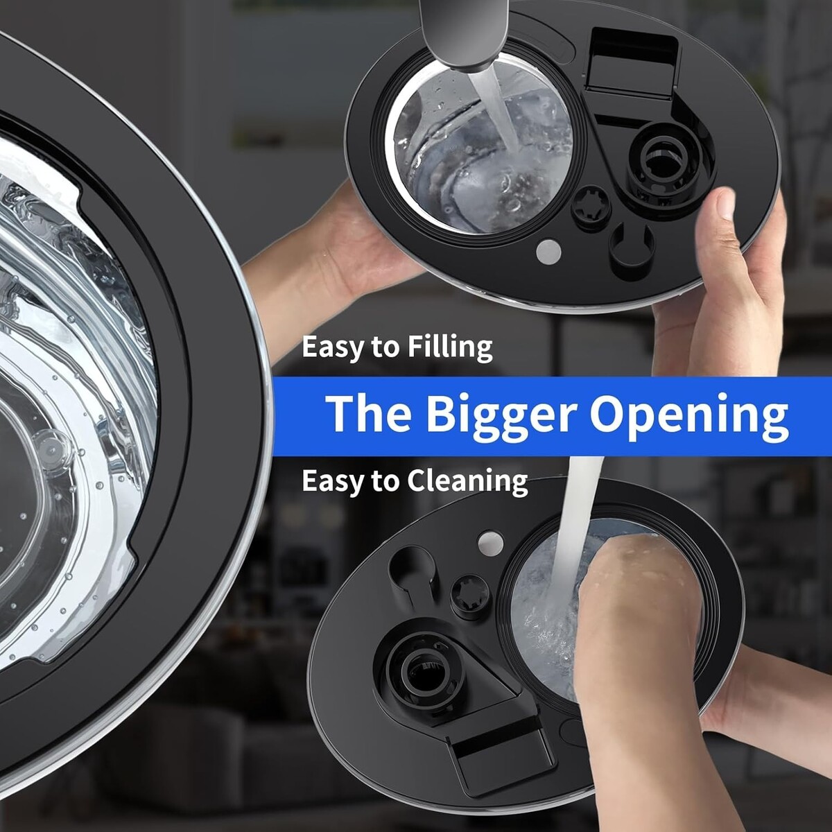 Large water tank opening for hassle-free filling and cleaning.