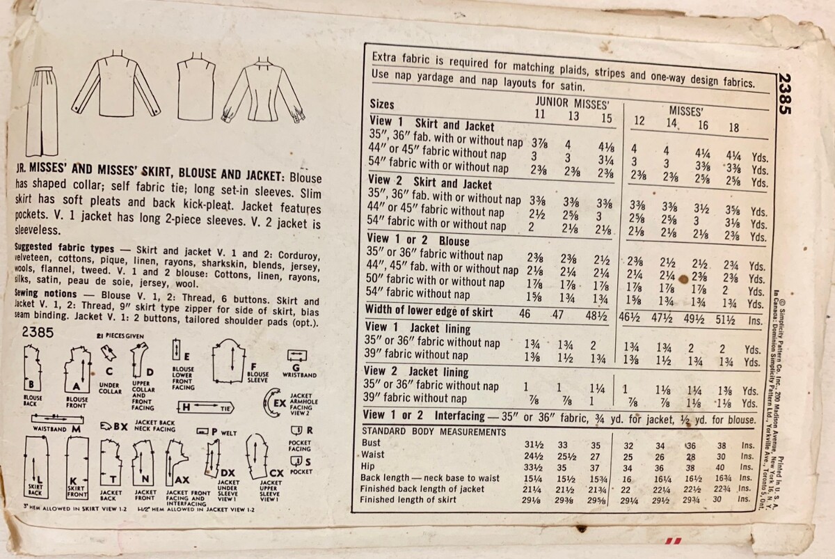 VTG Sewing Pattern Simplicity #2385 Size 12 Bust 32 Skirt, Blouse,Jacket 1957
