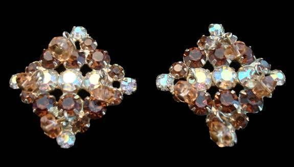 VTG Earrings Sparkling Square Aurora Borealis Amber Clip-On 1950S Womens