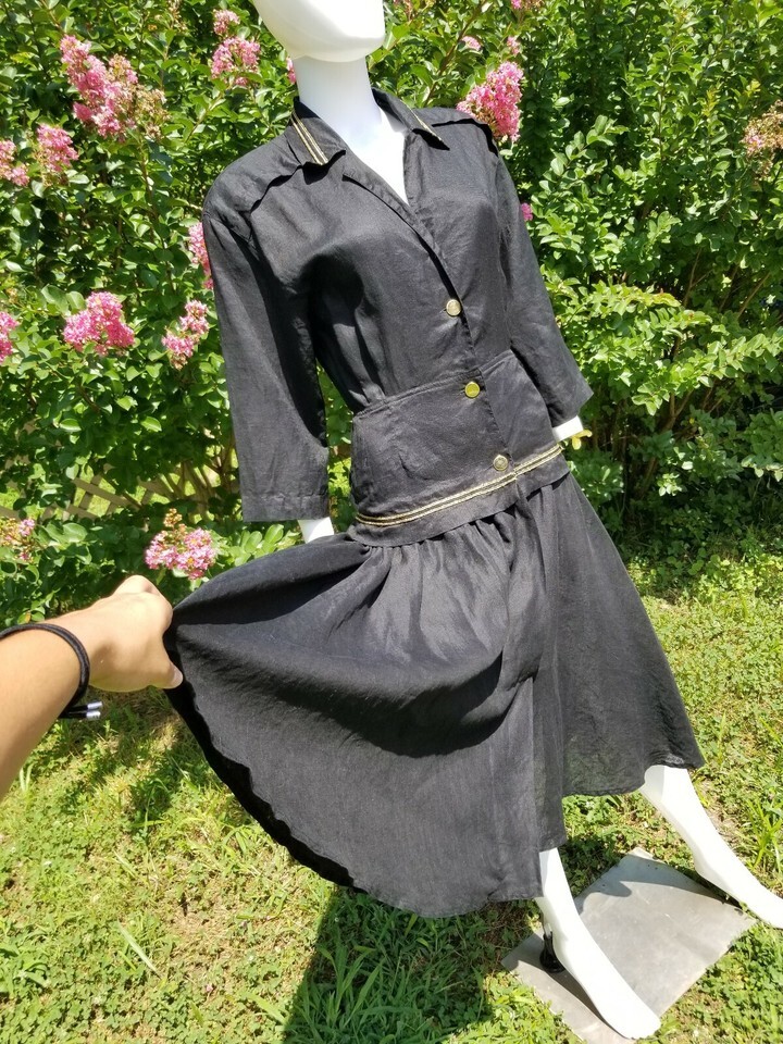 Vintage 1980s Annalisa Ferro Linen Black Sailor secretary Style Midi Dress W26"