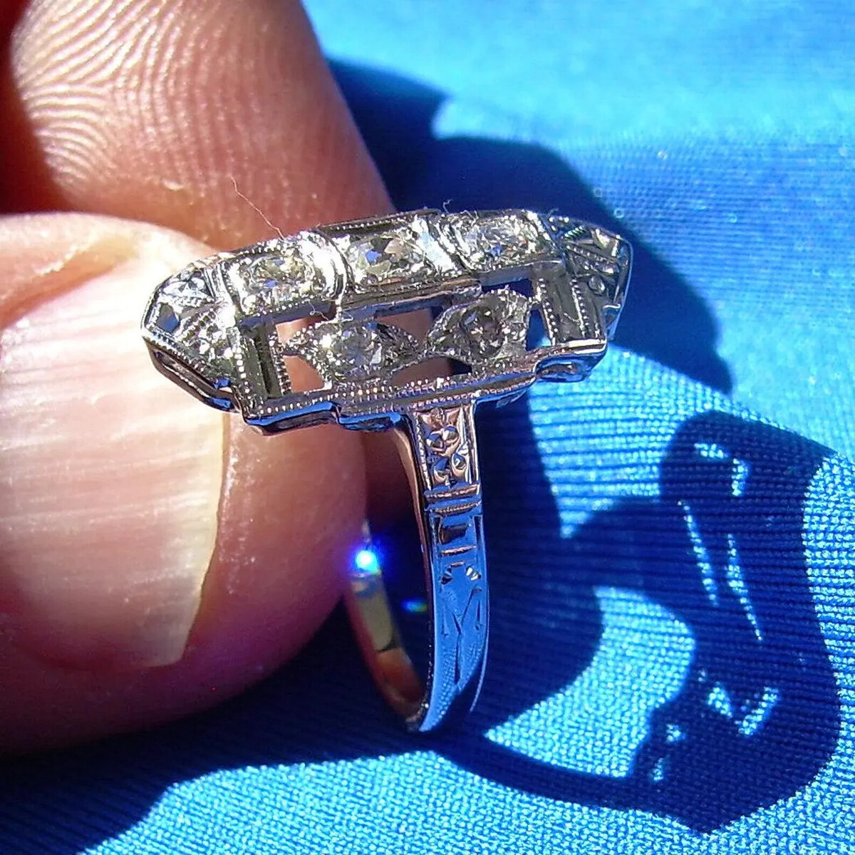 Elegant unique geometric jazz era original design ring setting.