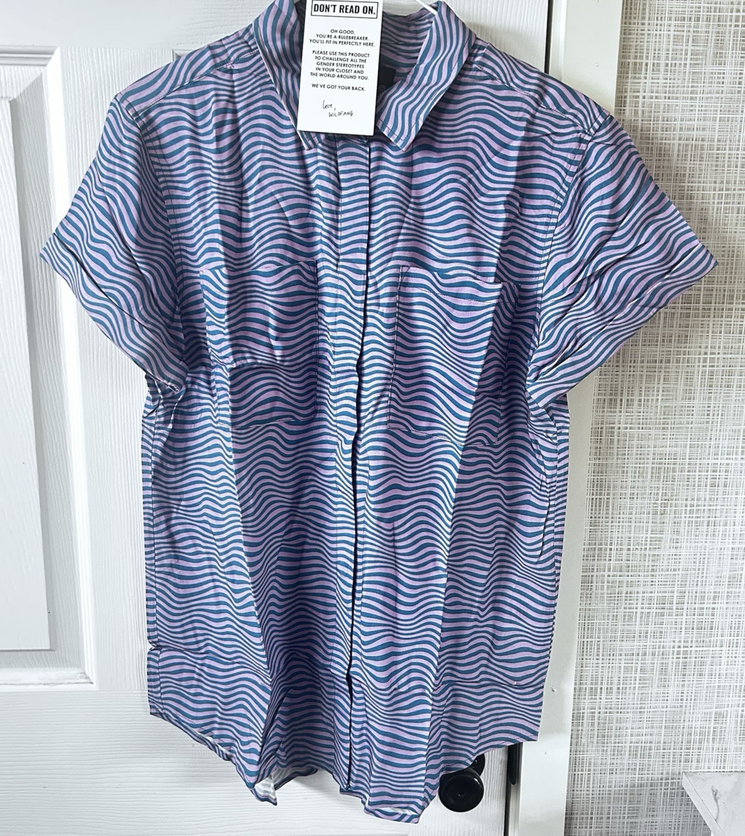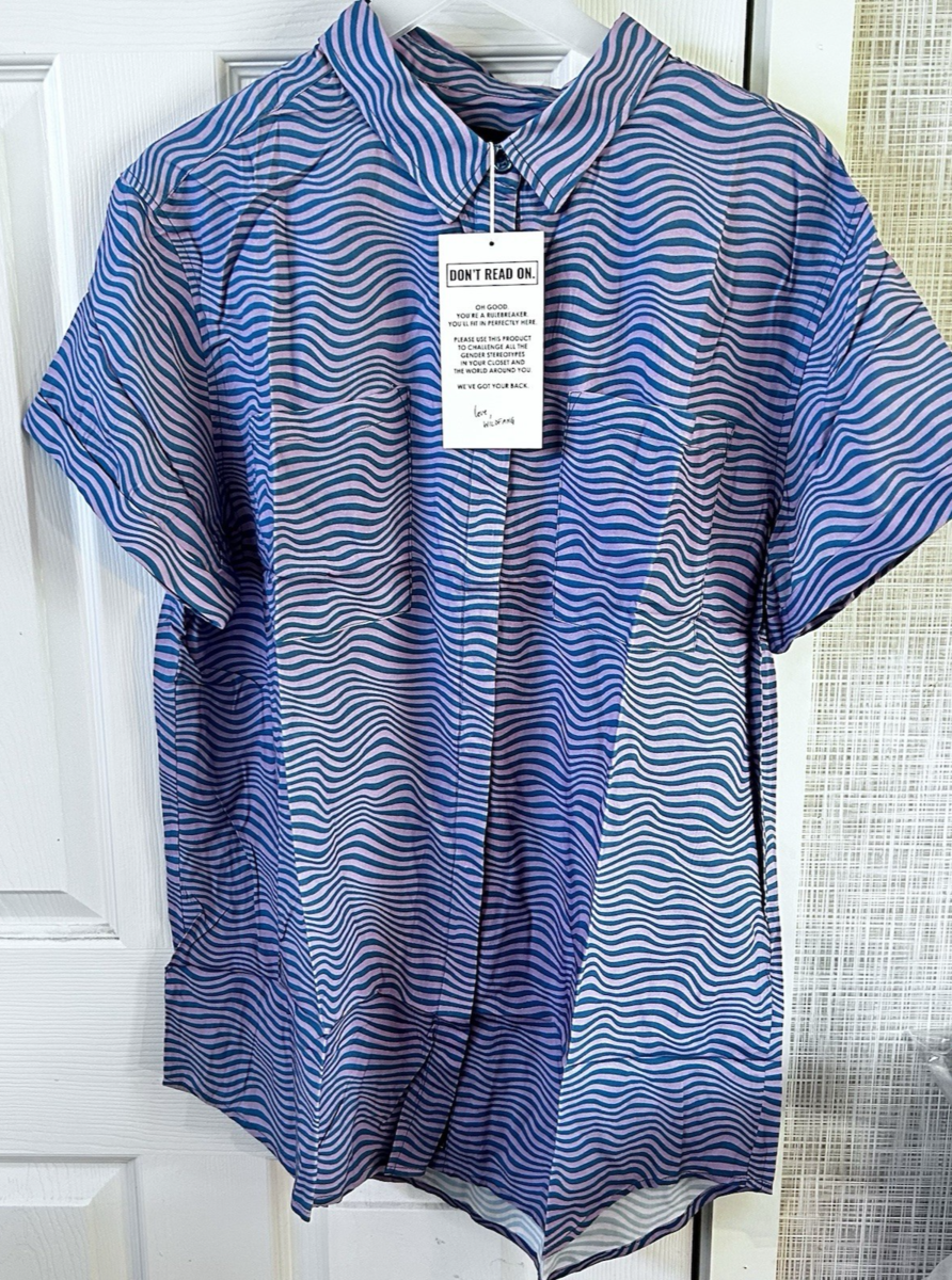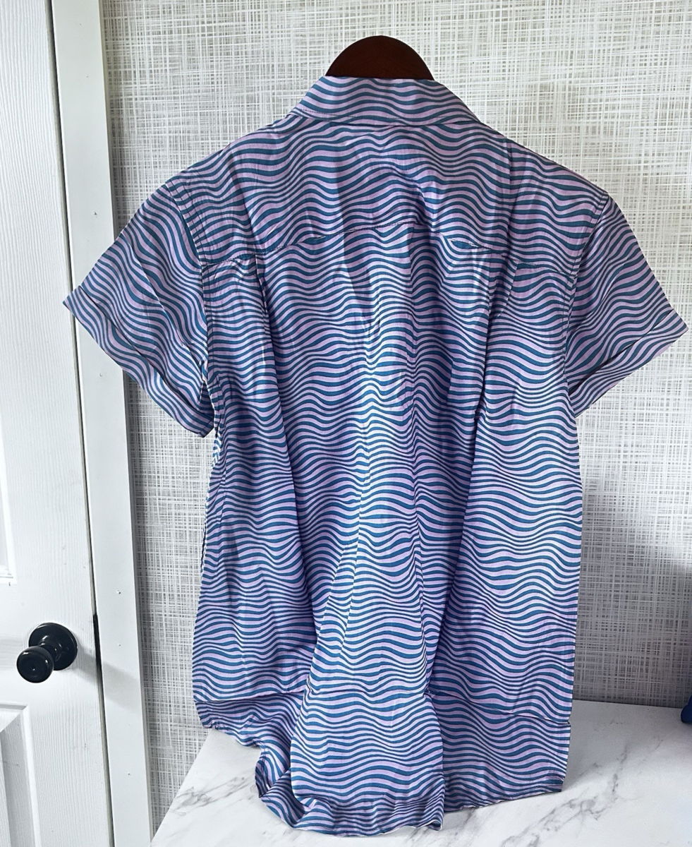 Wildfang The Essential Button Up Short Sleeve Sonic Print Pink Blue Large BBB