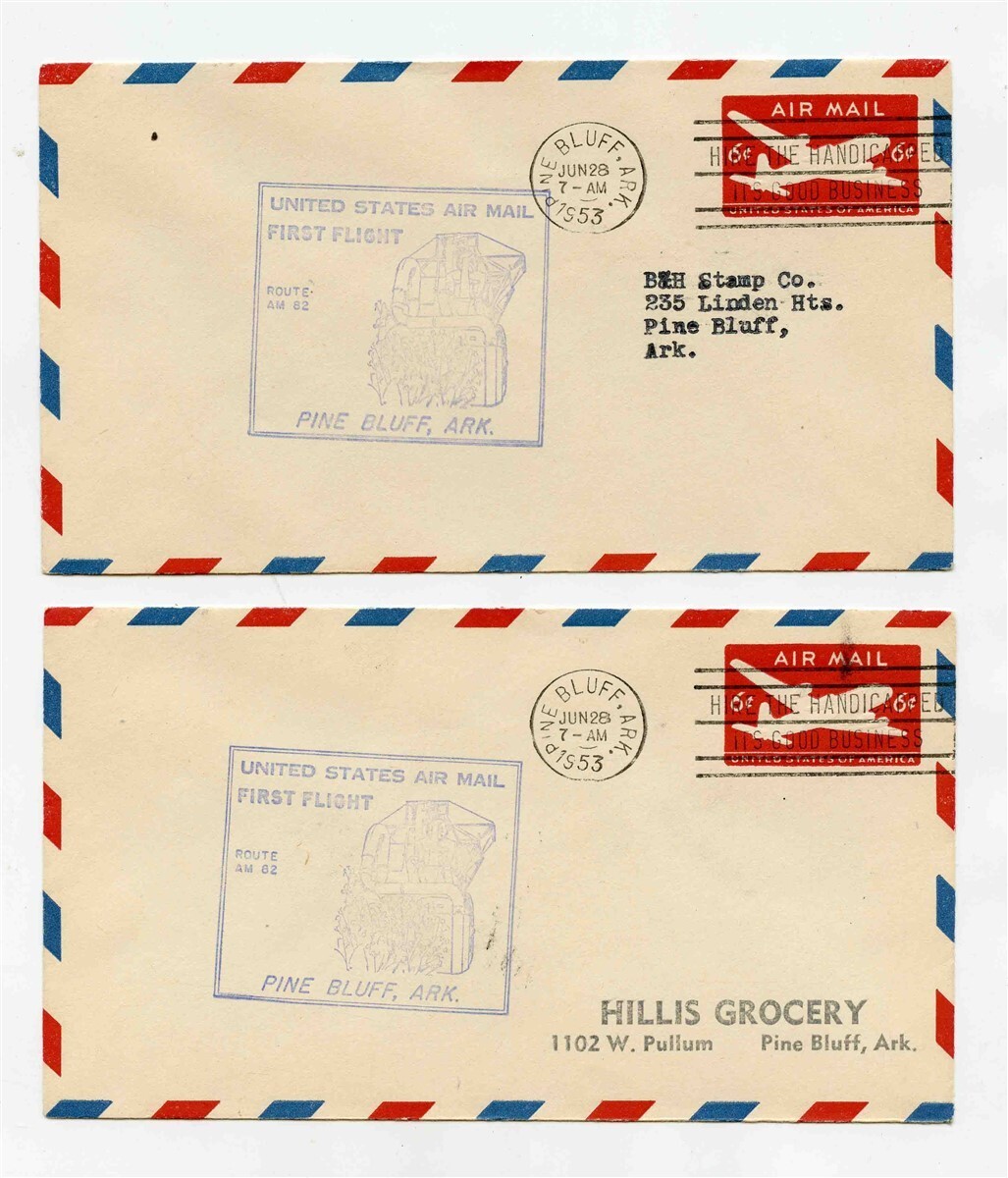 There are 2 different 6 cent air mail covers in this lot. 1953 United States Air Mail 1st Flight Covers AM 82 . Postmarked Pine Bluff Arkansas