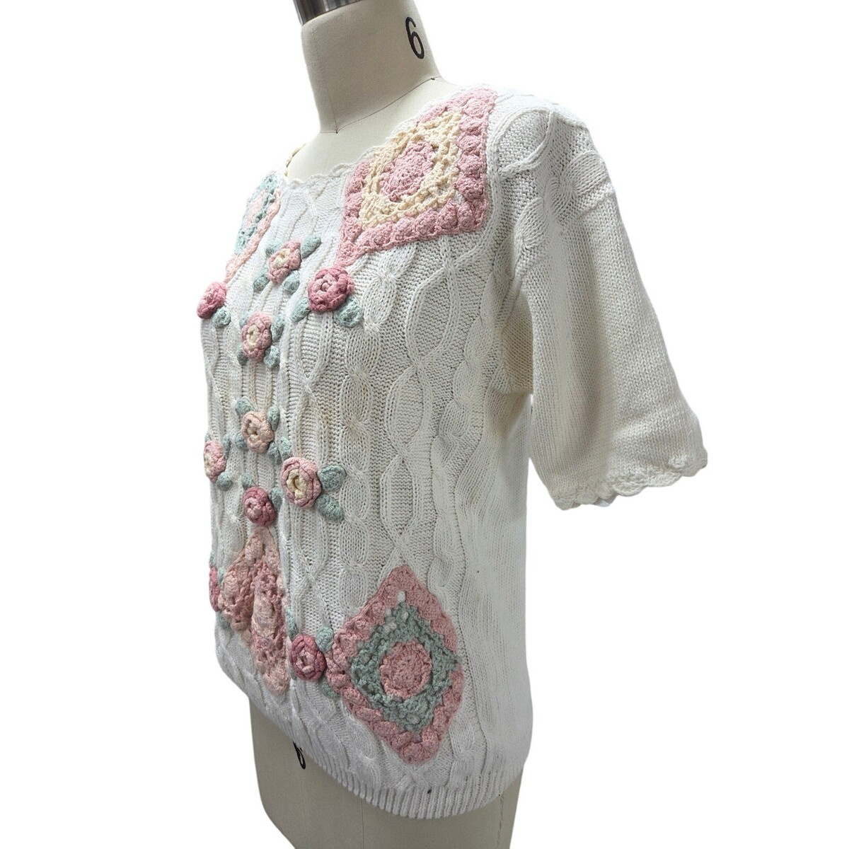 VTG 1990s Colleens Collectables Cottagecore 3D Crochet Floral Knit Top