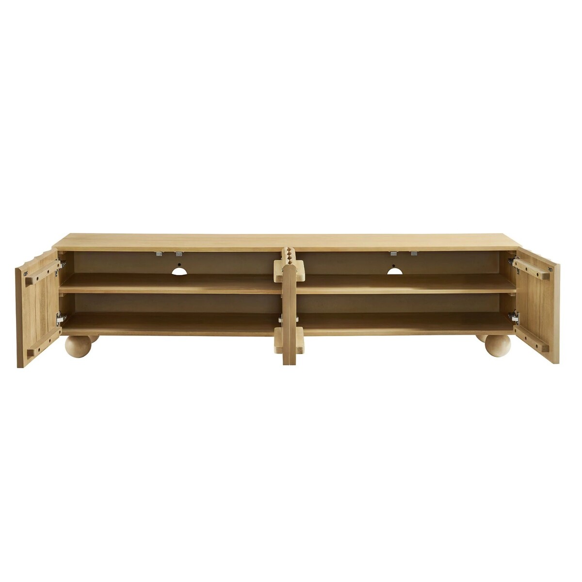 Crafted from solid wood, this 71-inch TV stand offers ample storage behind four easy open finger pull doors, concealing spacious shelving for media components, books, and decor.