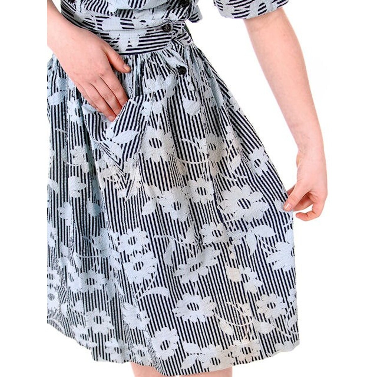 VTG 1940s Seersucker Day Dress Blue Black Stripe Cone Pockets Cottagecore S