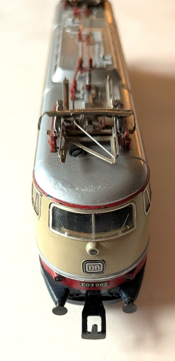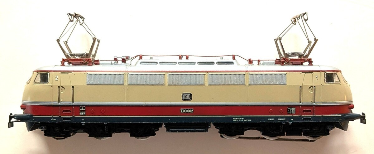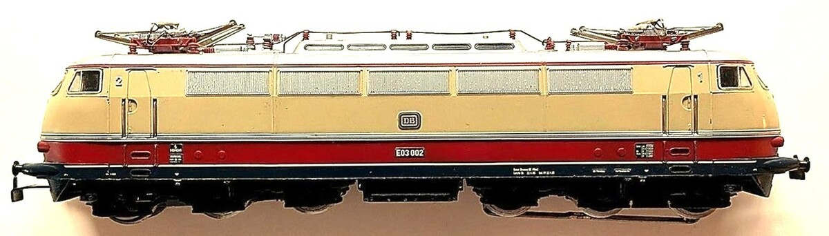 Marklin Marklin H0 3053 E03 electric loco lettered as Deutsche Bahn. Good pantographs and pickup shoe without major wear. Freshly oiled and tested, works as she should. Nice box without major tears.