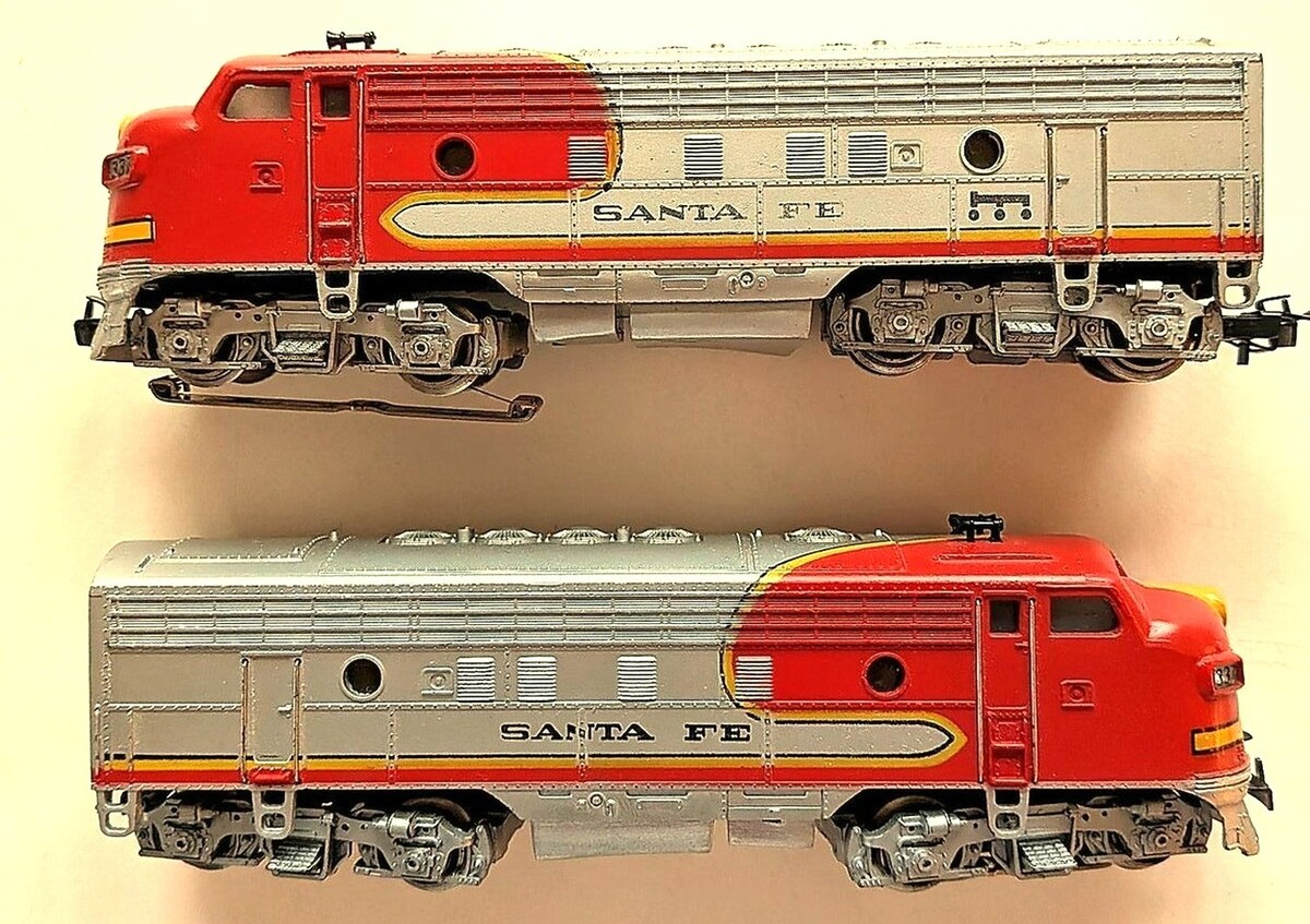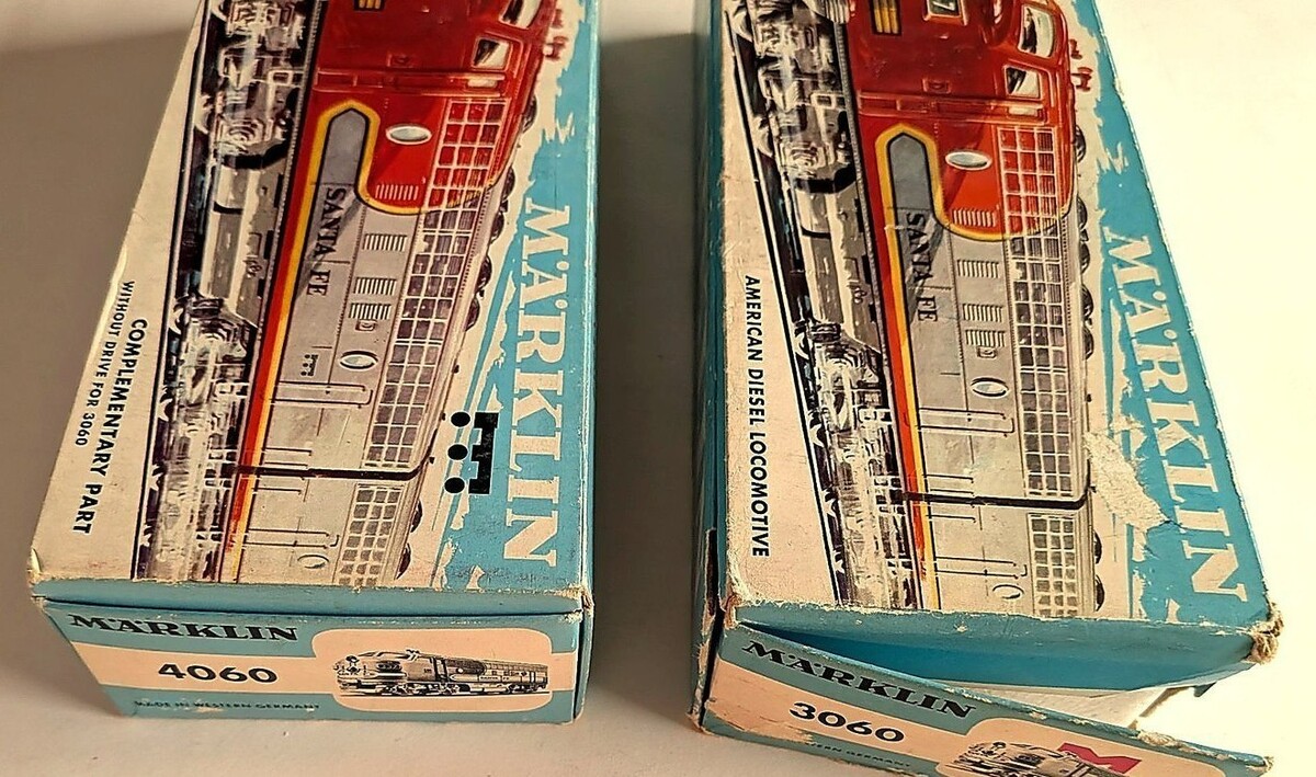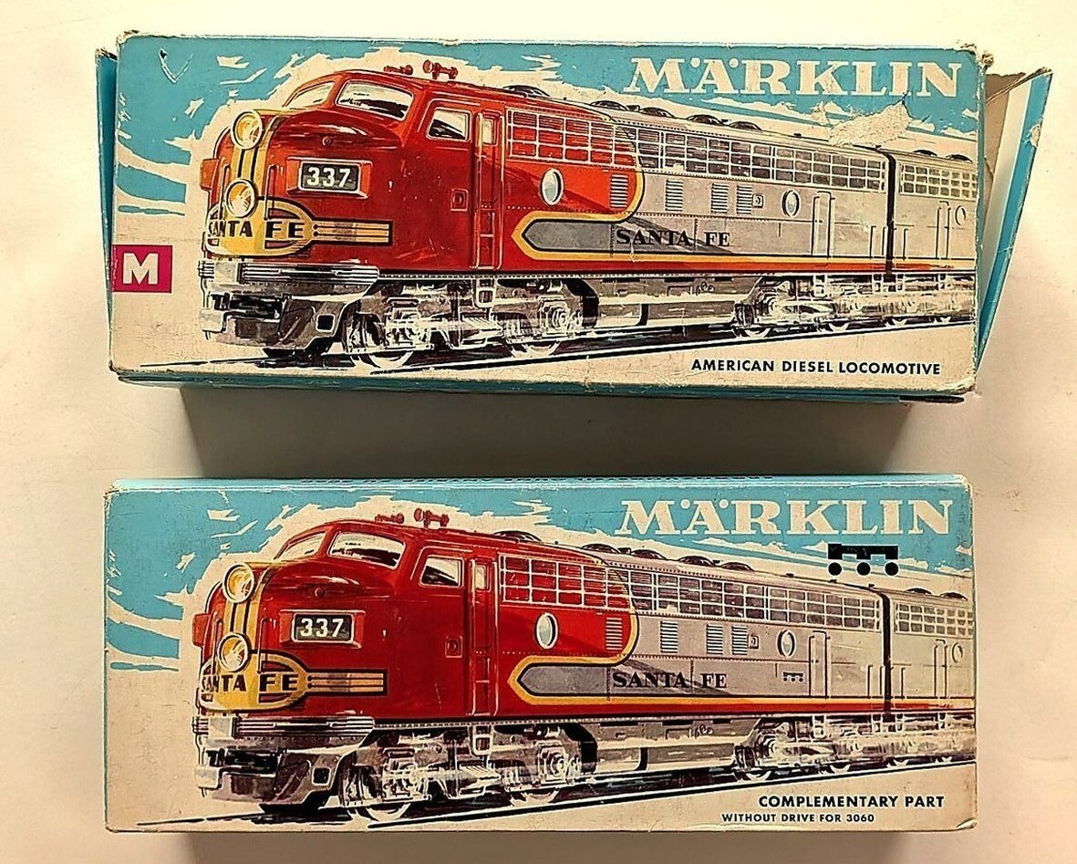 Marklin Marklin H0 3060 and 4060 pair of Santa Fe lettered F7 diesel locos. 3060 is the powered unit, while 4060 is unpowered but lighted. Older set with some scratching on the body, Freshly oiled and tested, and they work as they should. Driver has good pickup show, while the one on the roller looks like new (see photos). Both in original boxes which are somewhat torn but functional.