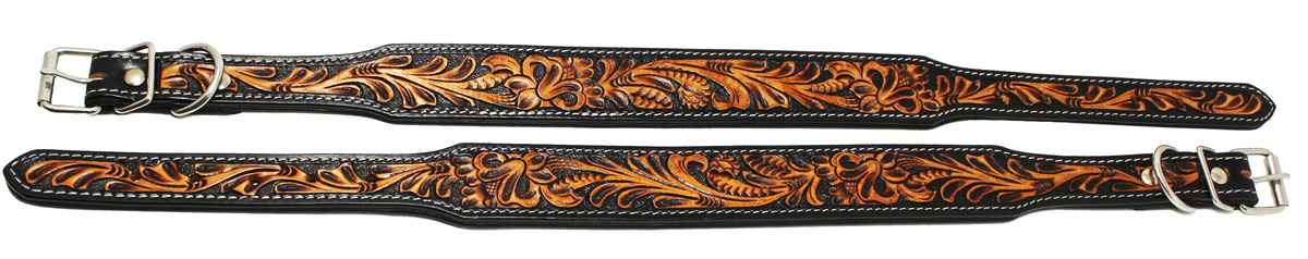 Challenger genuine handmade full grain leather heavy-duty dog collar comes fully padded for comfort. Collar is accented with a hand-tooled floral inlay. Rust-free stainless steel hardware.
