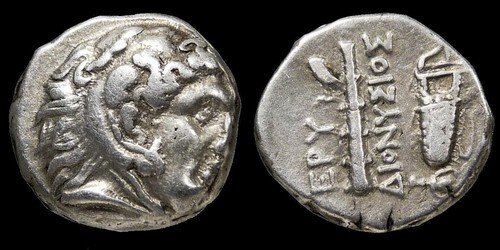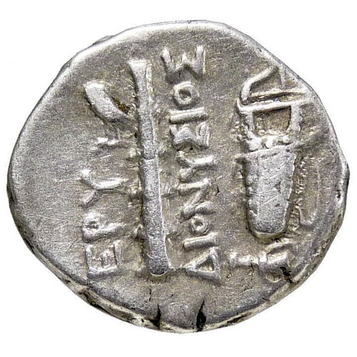 Reverse: EPY / ?IONY?IO? (Dionysios in Greek) Club and bowcase; to left, owl standing left, head facing; kantharos (footed drinking cup with high handnles) to lower right.