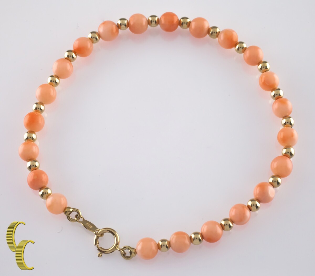 Armband aus 14-Karat-Gelbgoldperlen und runden Korallenperlen mit Karabinerverschluss, 6,75 Zoll lang