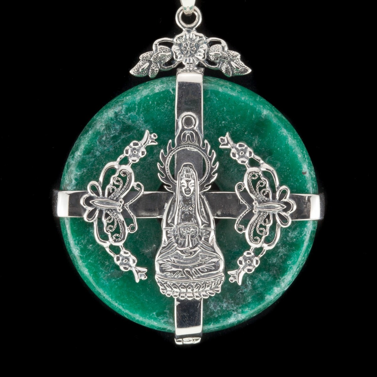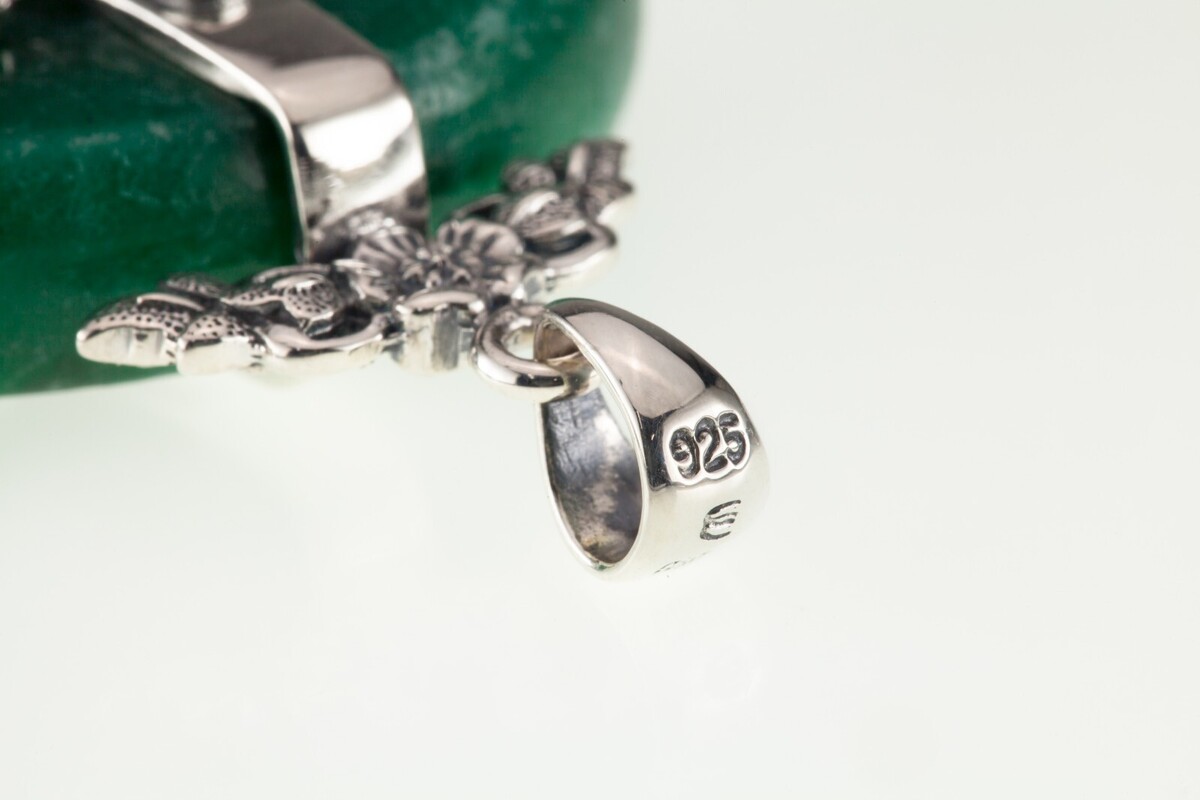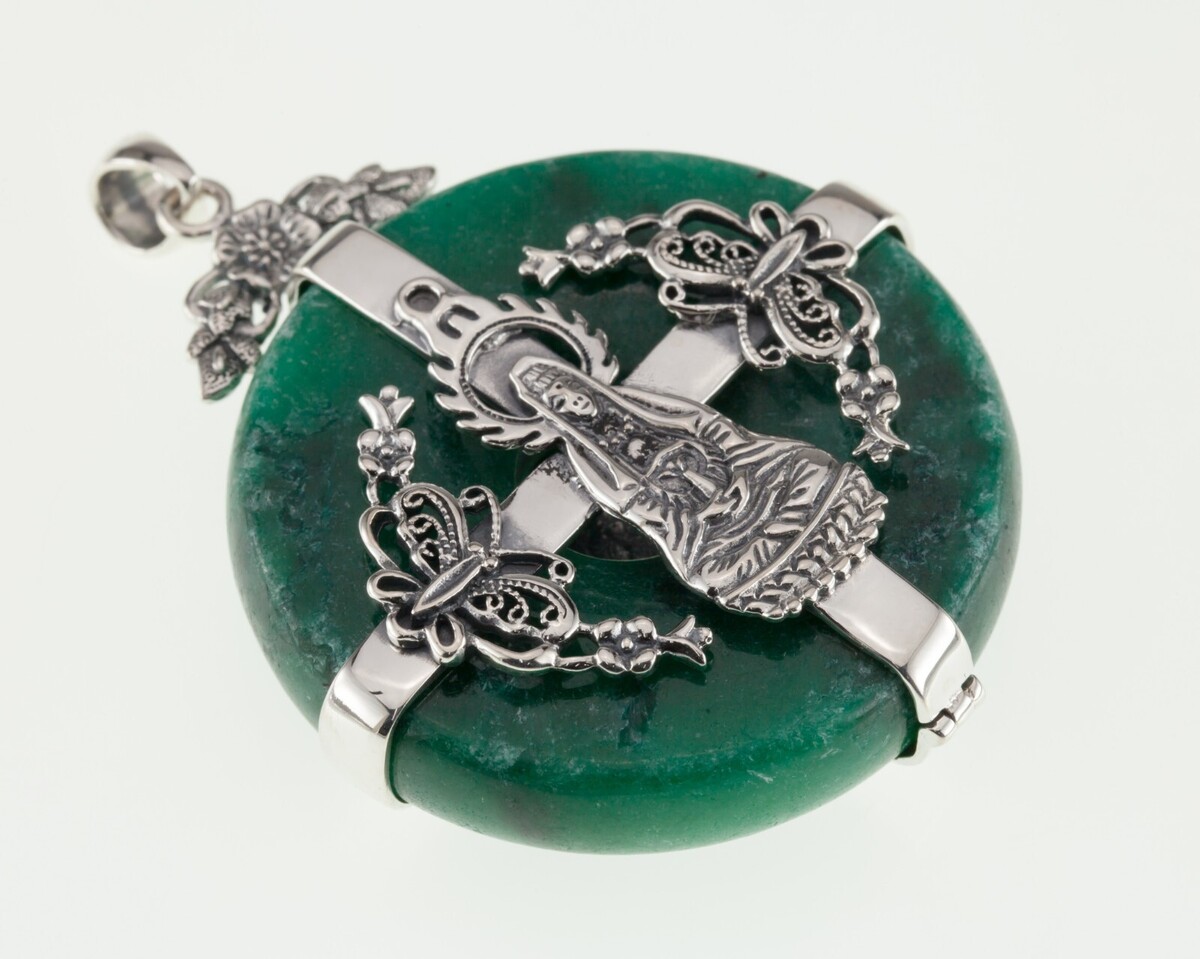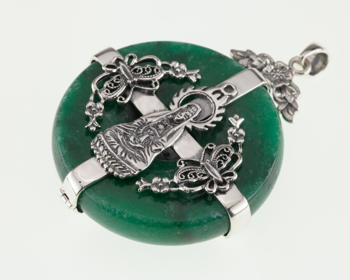 Merkmale 8,5 mm dick von 44,5 mm breit grünes Jade -Steine in Sterling mit Buddha mit filigrischen Details