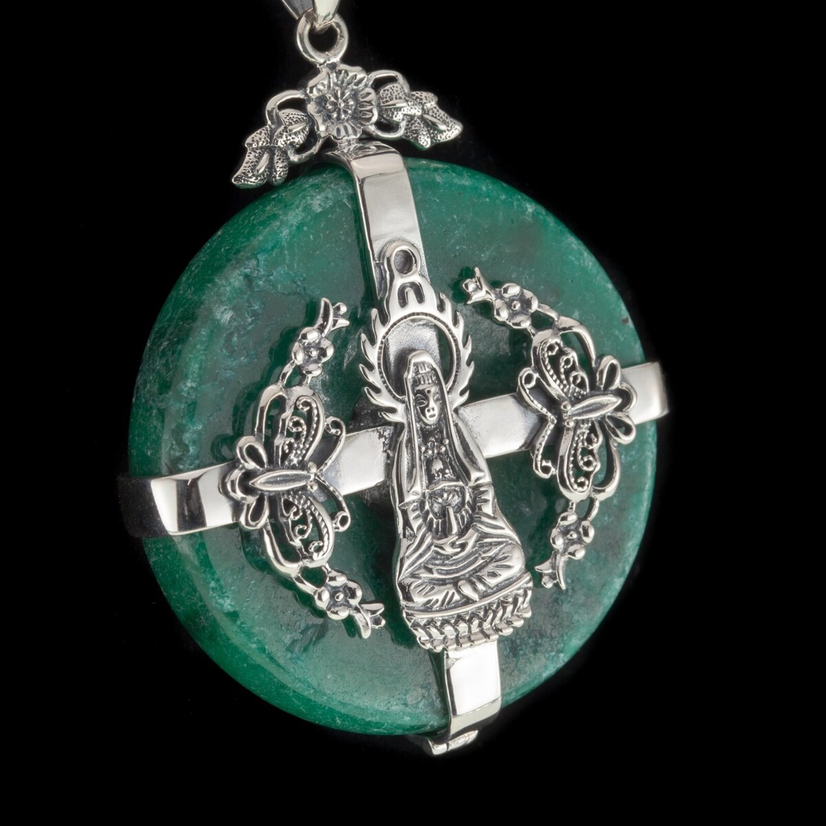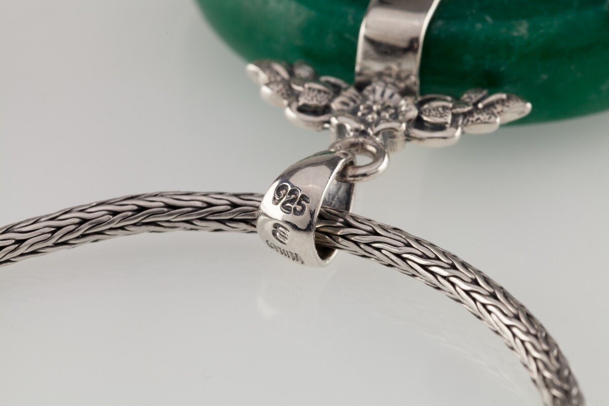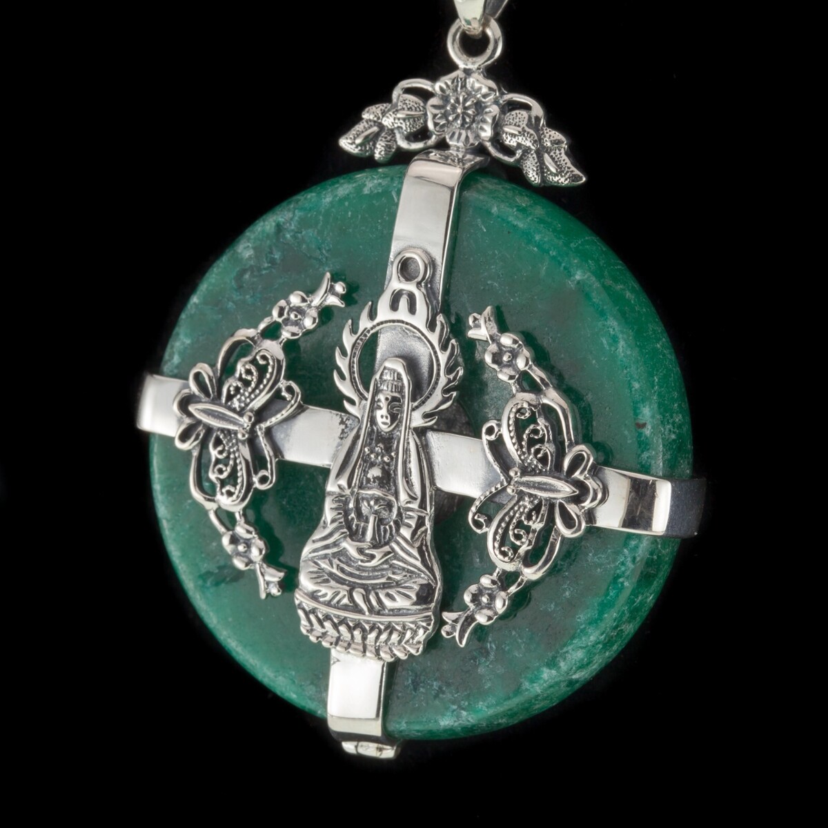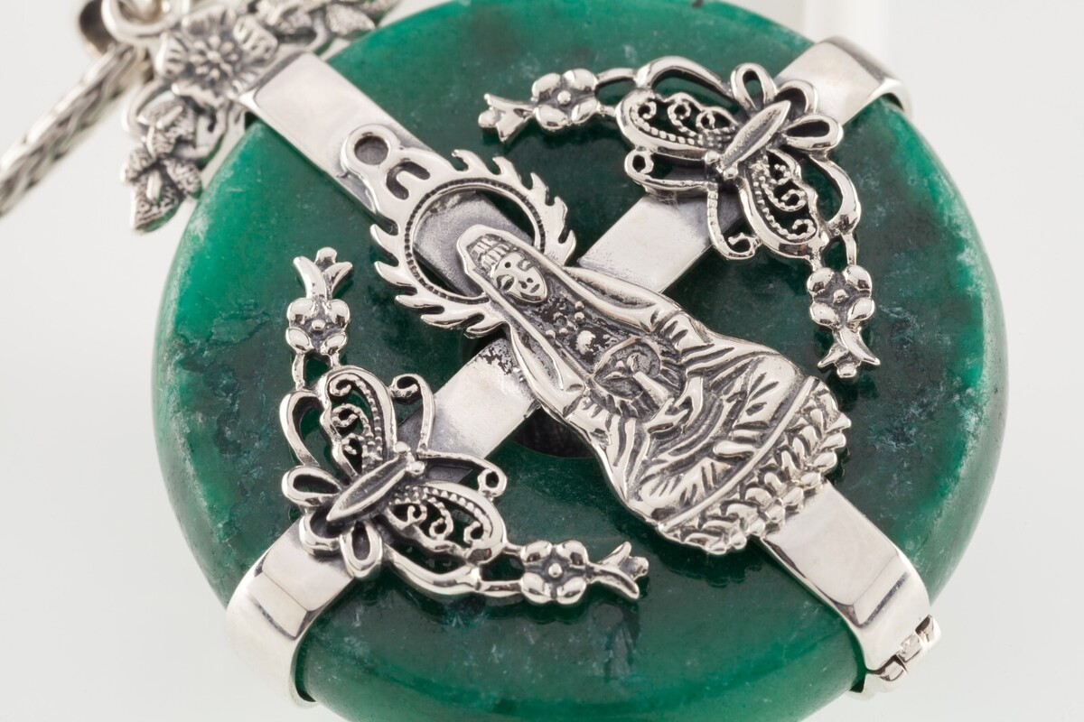 Merkmale 8,5 mm dick von 44,5 mm breit grünes Jade -Steine in Sterling mit Buddha mit filigrischen Details