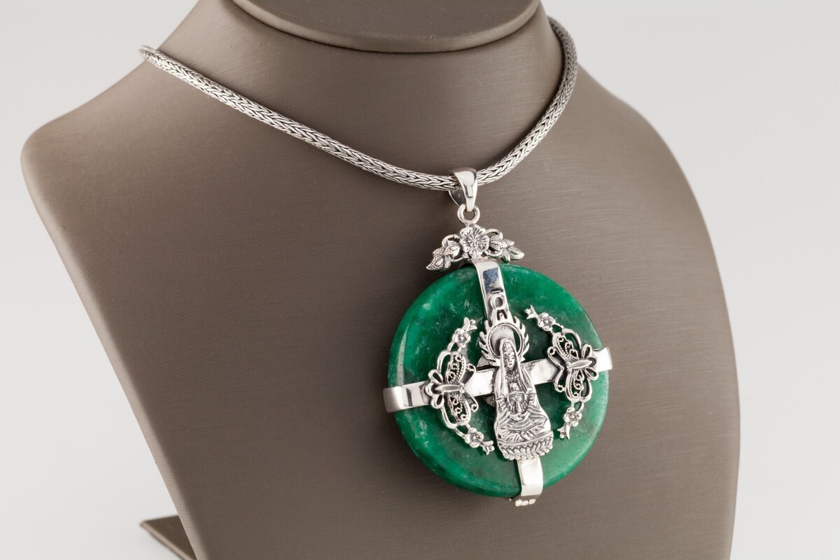 Schone Buddhismus Sterlingsilber Grüner Jade 16 " Halskette und Anhanger 72.4gr