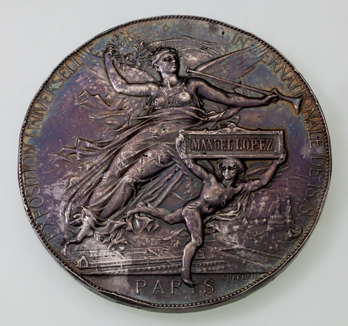1878 Silbermedaille, Pariser Weltausstellung von Chaplain, 68 mm breit