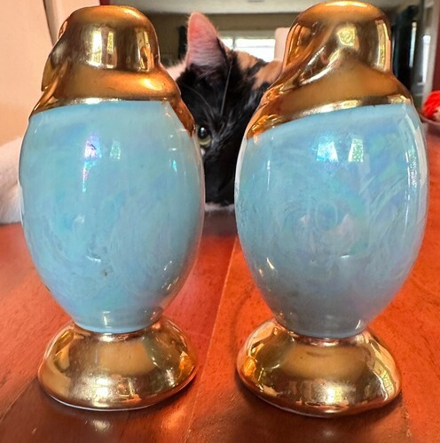 Antique Pearl Lusterware Turquoise & 22K Gold Leaf Salt & Pepper Shakers Rare