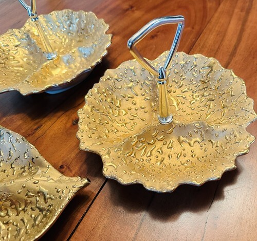 Add a touch of vintage charm to your collection with this beautiful MCM Weeping Bright candy plus 2 matching trinket dishes. The 2 dishes with top handles feature a round shape and go perfectly with the double leaf design candy or trinket dishes ; all are made of 22K gold-painted porcelain. The glossy finish and Weeping Gold pattern make it a stunning decorative piece that is sure to catch the eye.