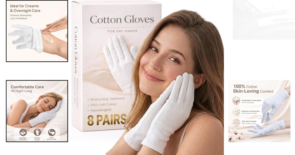 Gentle White Cotton Moisturizing Gloves - 8 Pairs for Dry Skin Overnight Relief