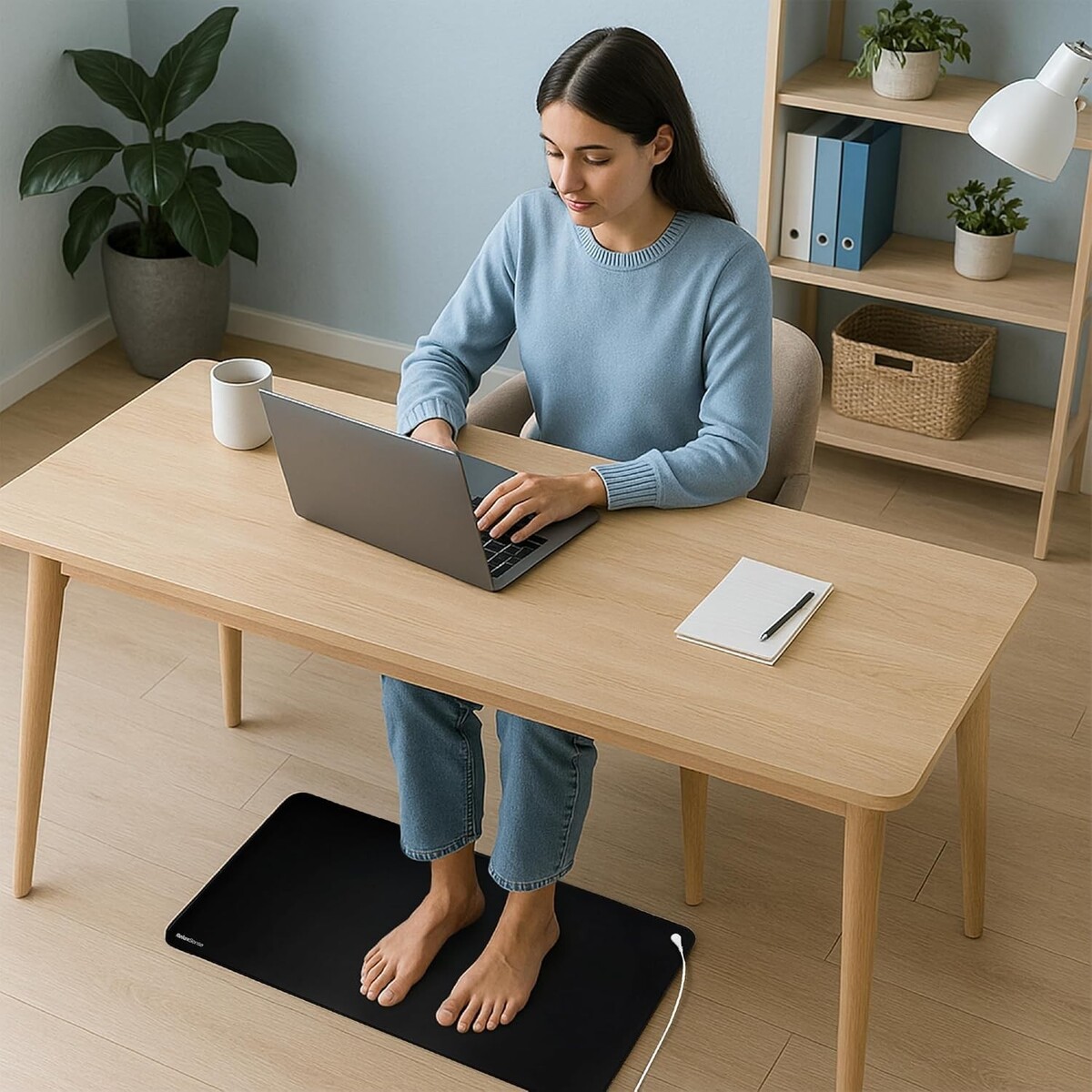 Unroll your earthing mat on any flat surface: your bed, desk, or floor.