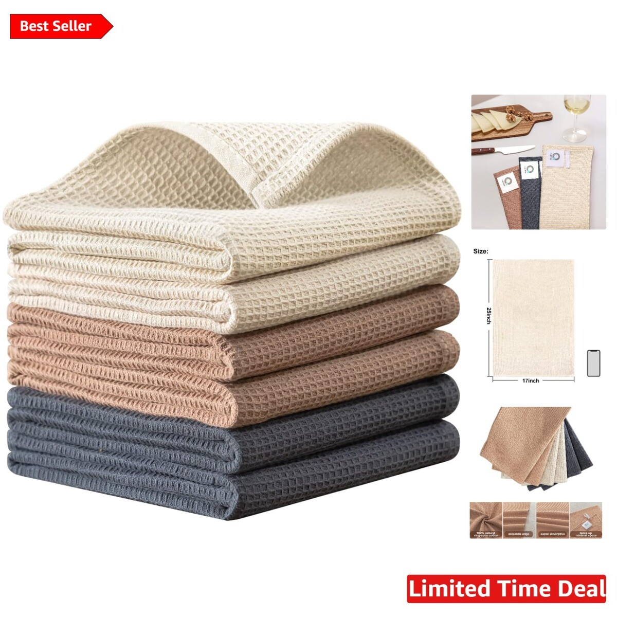 Functional 6-Piece Kitchen Towel Set - Waffle Weave, 100% Cotton, Multi-Colored