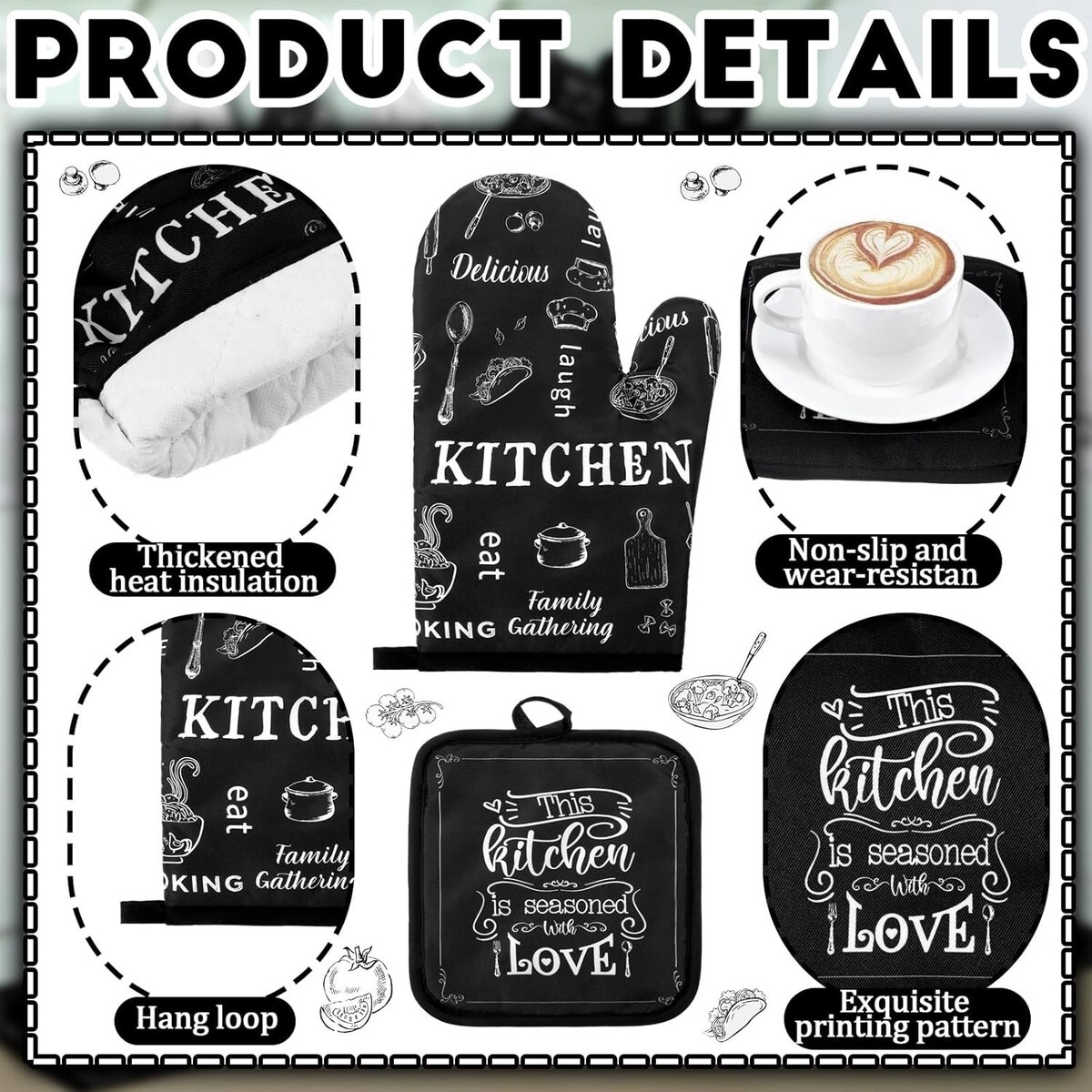 Quality Materials: Crafted from superior microfiber for towels, polyester for rugs and pot holders, and equipped with thermal insulation foam and non-woven fabric in the oven mitts for ideal heat resistance.