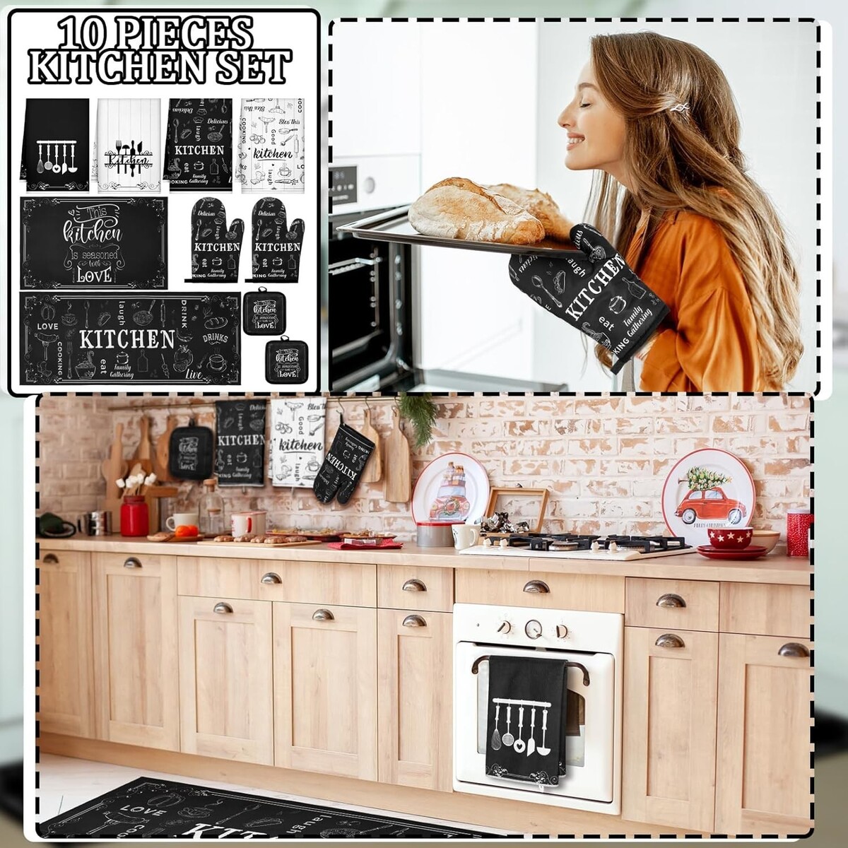 Elegant 10-Piece Black and White Kitchen Decor - Towels, Rugs Mitts Included
