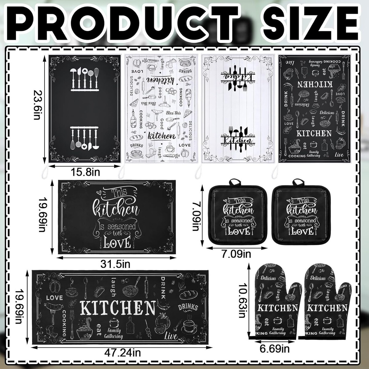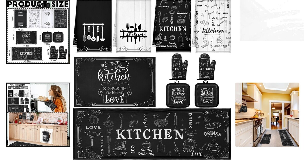 Elegant 10-Piece Black and White Kitchen Decor - Towels, Rugs & Mitts Included