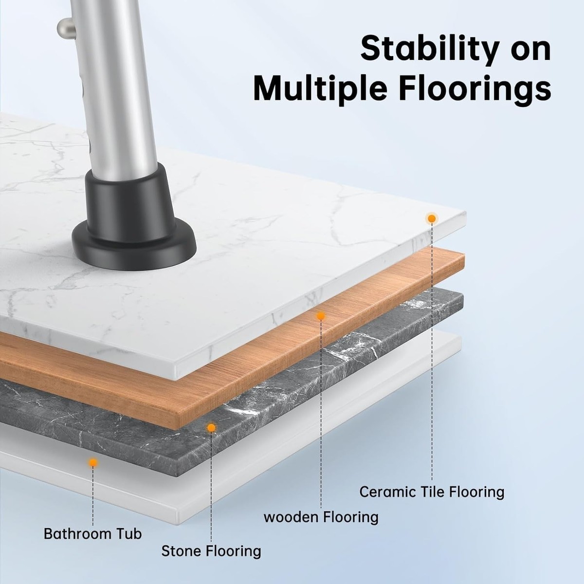 Cross-braced and angled legs with non-slip feet for enhanced stability, preventing slips and falls in wet areas.