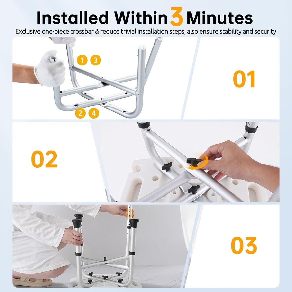 3-minute installation without tools, ideal for individuals with strength difficulties.