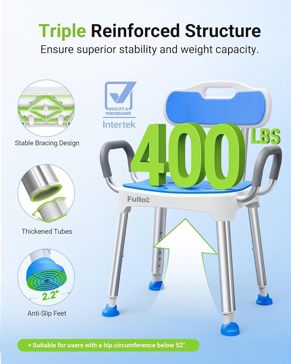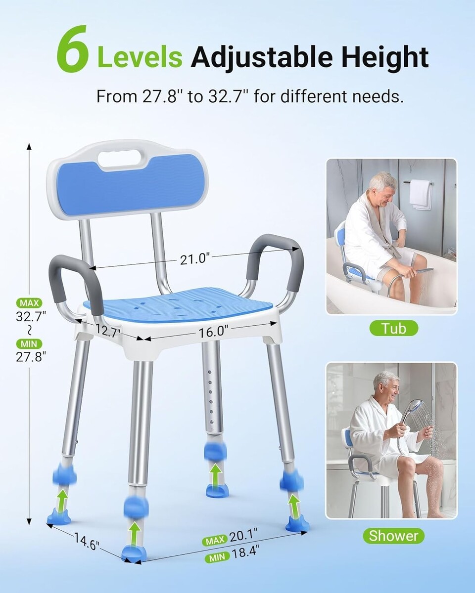 Adjustable Shower Seat with Padded Arms Non-Slip Design - 400 lbs