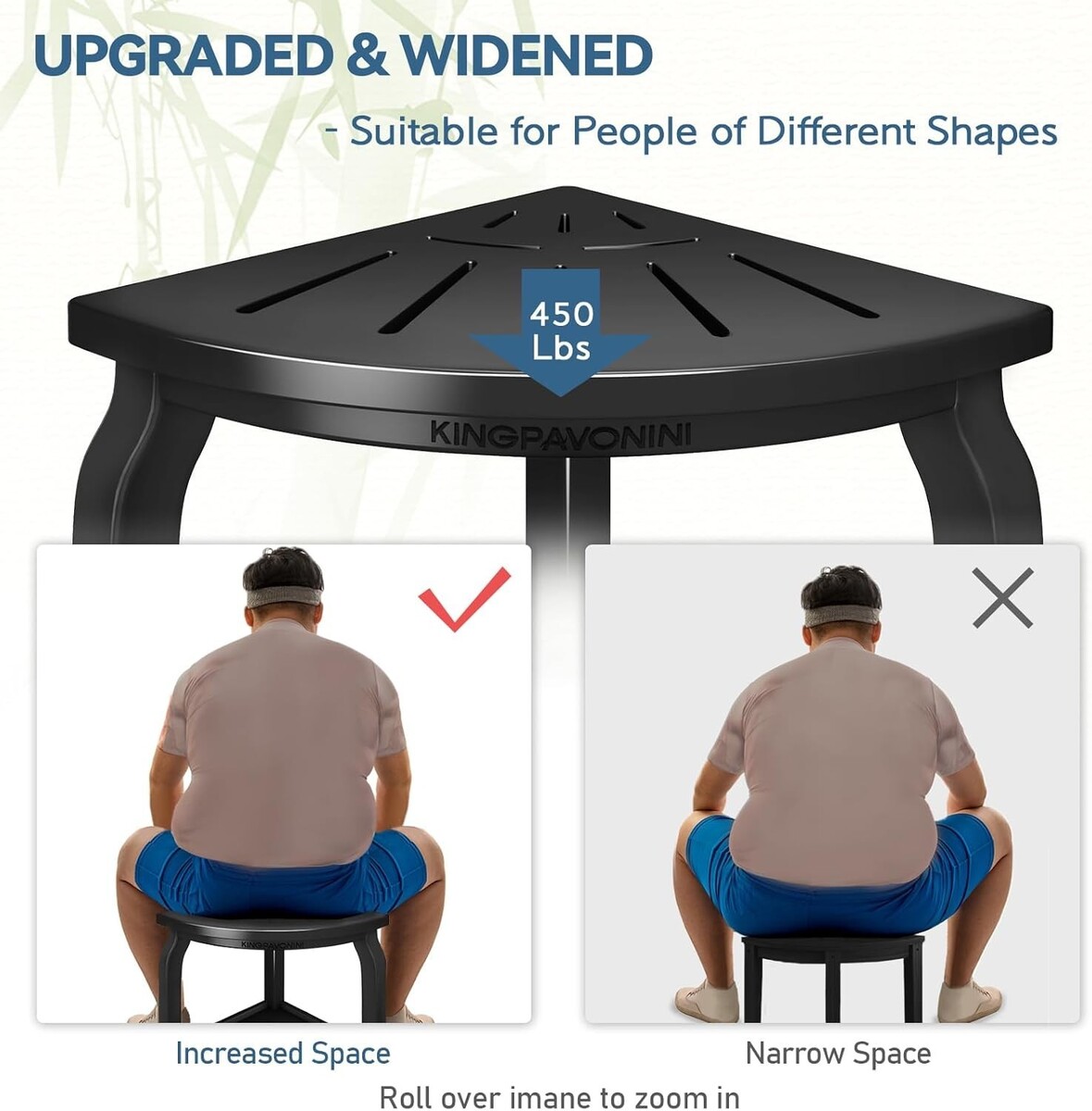 Superior Stability: Designed with thickened, outward-curving legs, this shower stool can support up to 450 pounds, ensuring your safety and peace of mind.