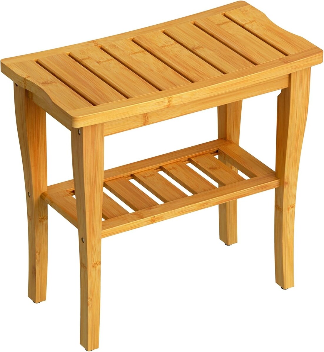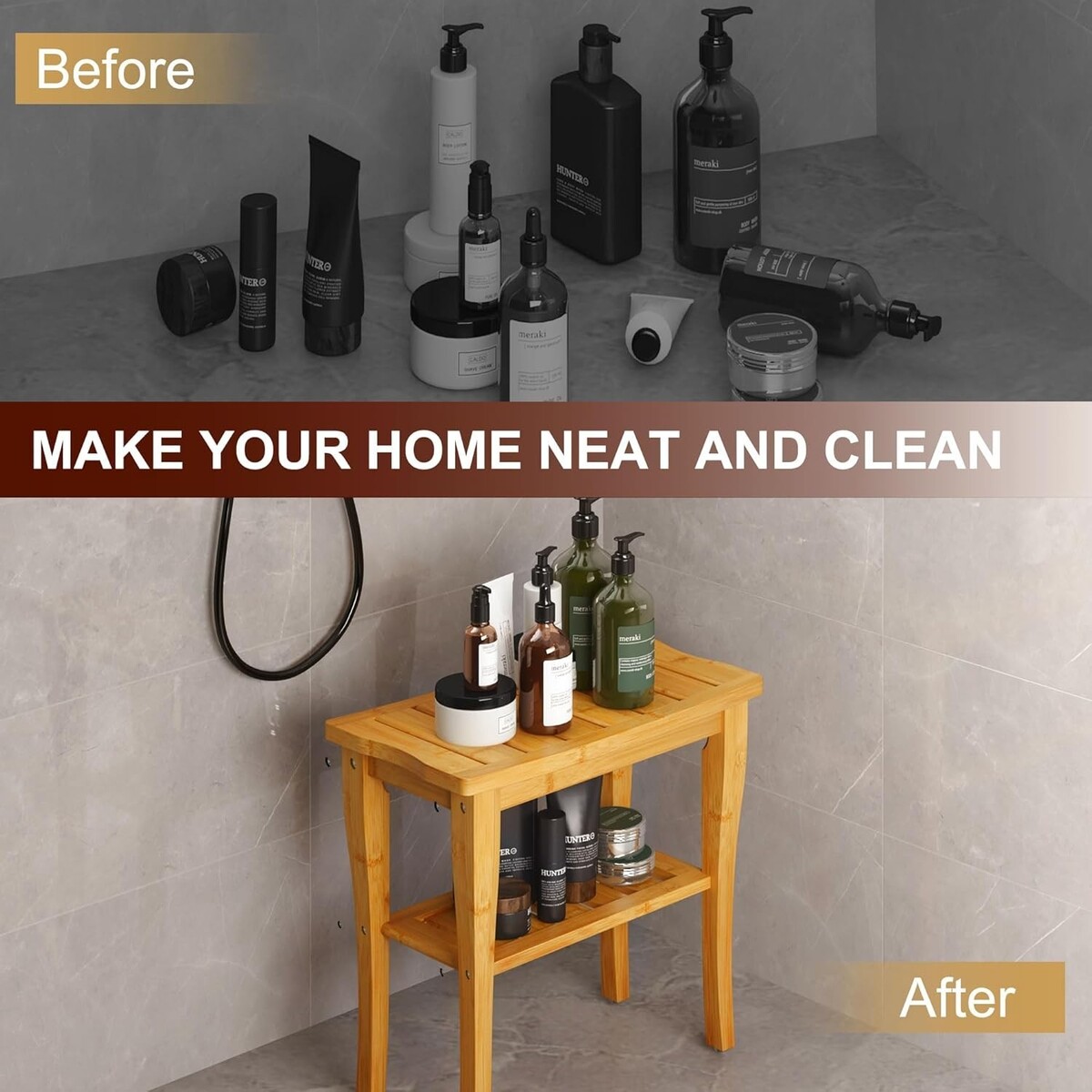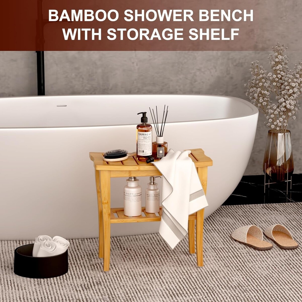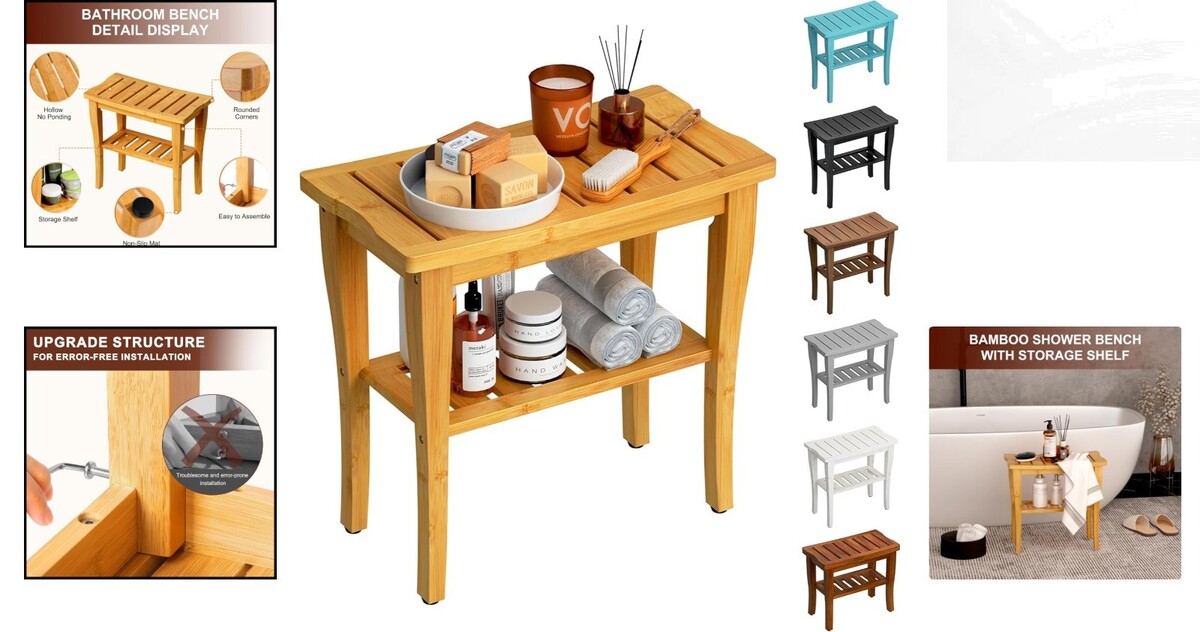 Elegant Bamboo Shower Stool with Storage Shelf - Waterproof & Anti-Skid Design