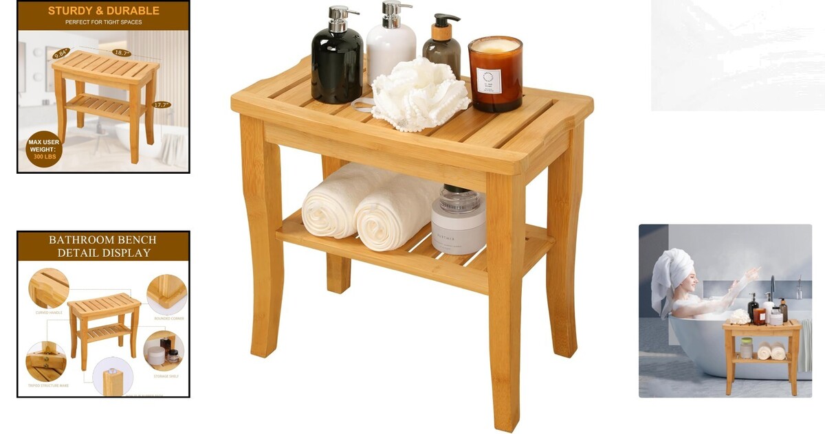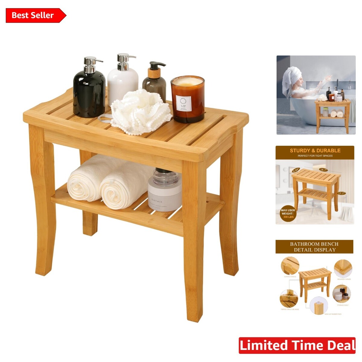 19 Inch 2-Tier Bamboo Shower Bench with Storage Shelf for Spa-Like Comfort