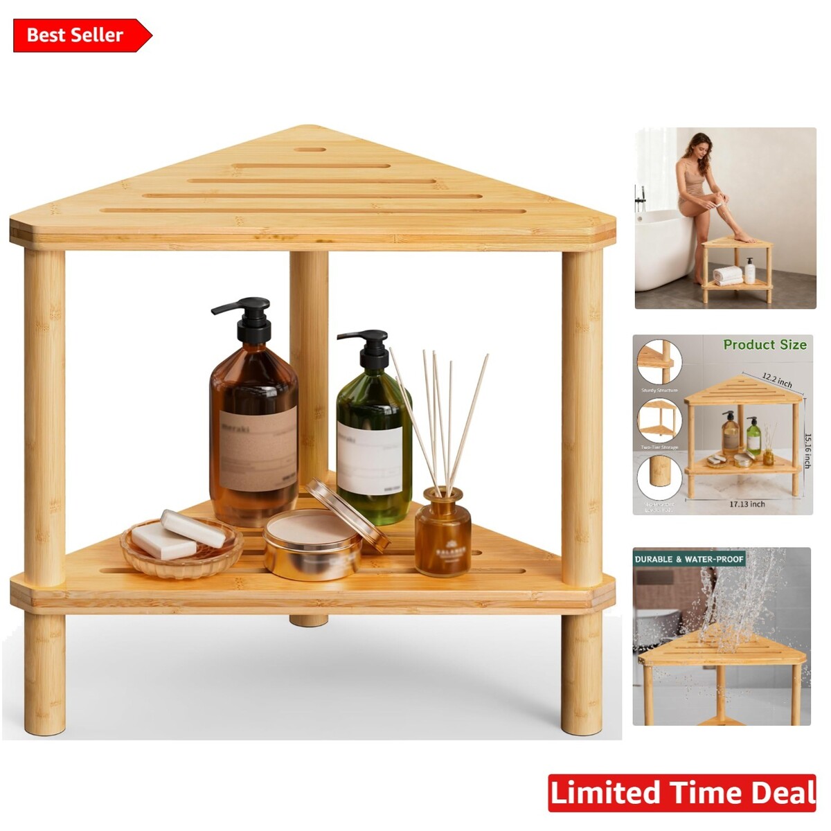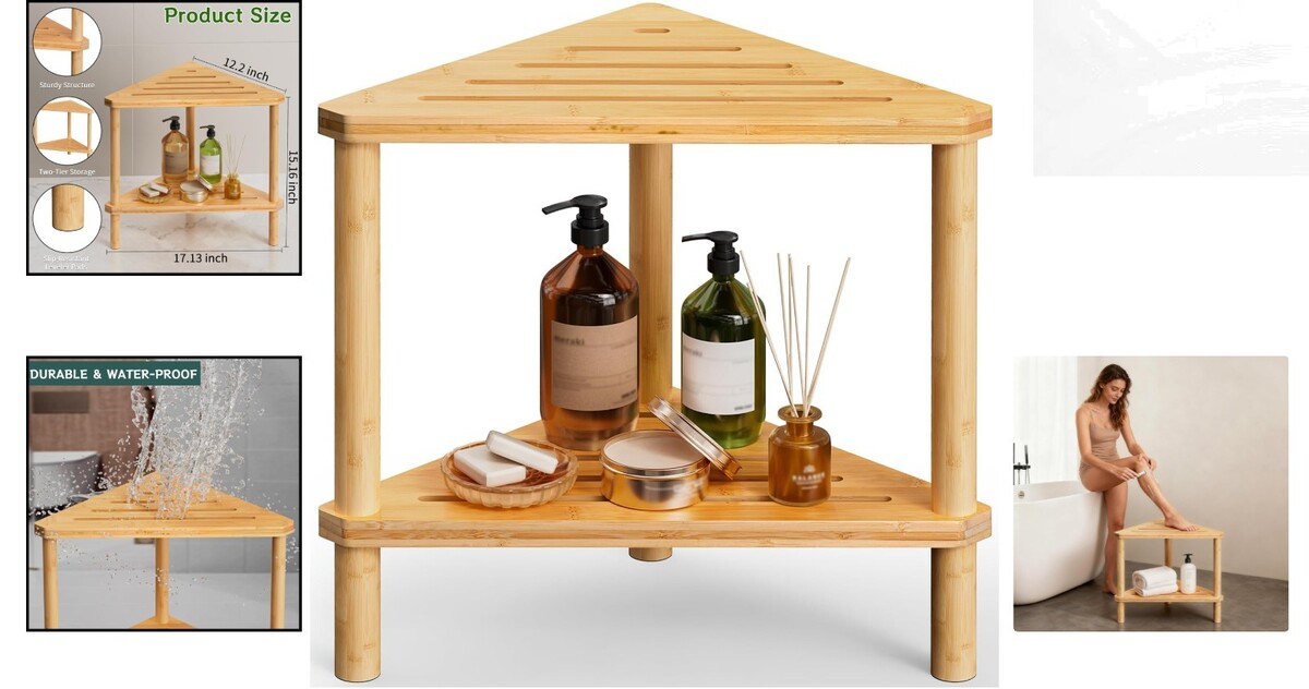 Natural Finish Bamboo Corner Shower Bench - 220 lbs Capacity & Waterproof Design