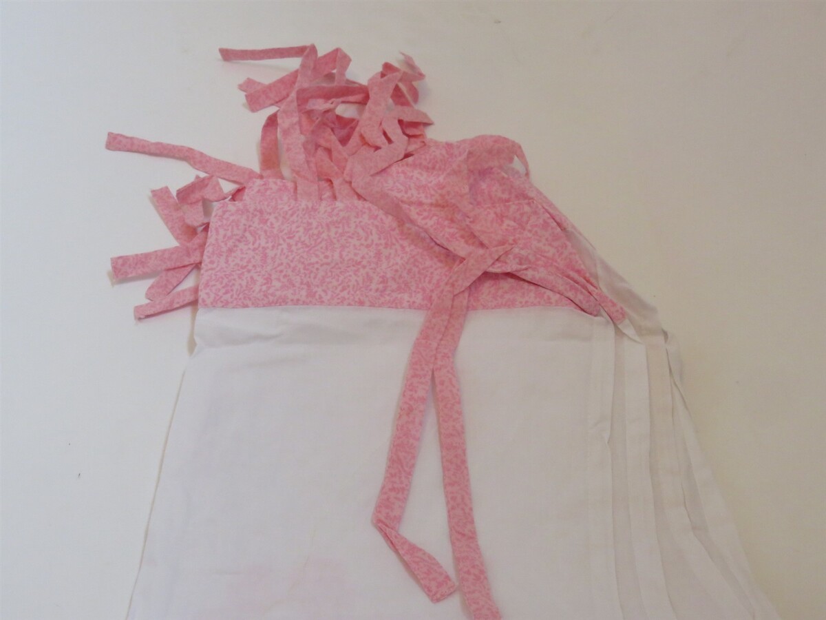 top and bottom of panels is bordered in a pink print- bottom is scalloped, tiebacks are in the same pink print