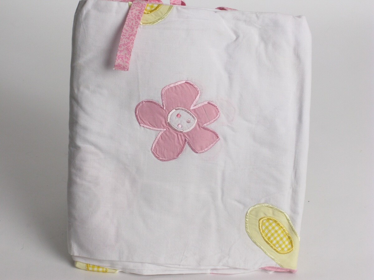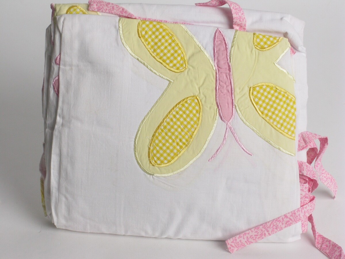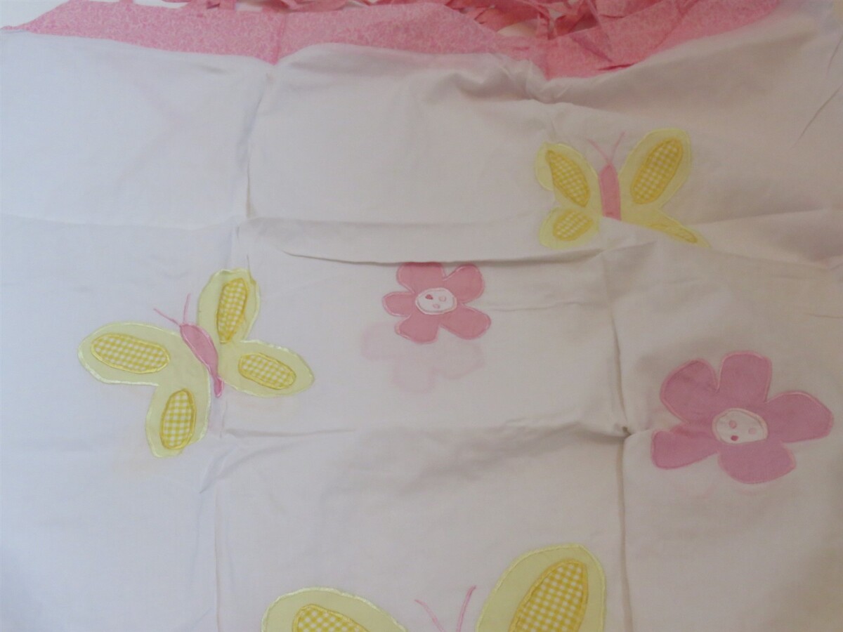 appliques of flowers and butterflies in pink and yellow on white