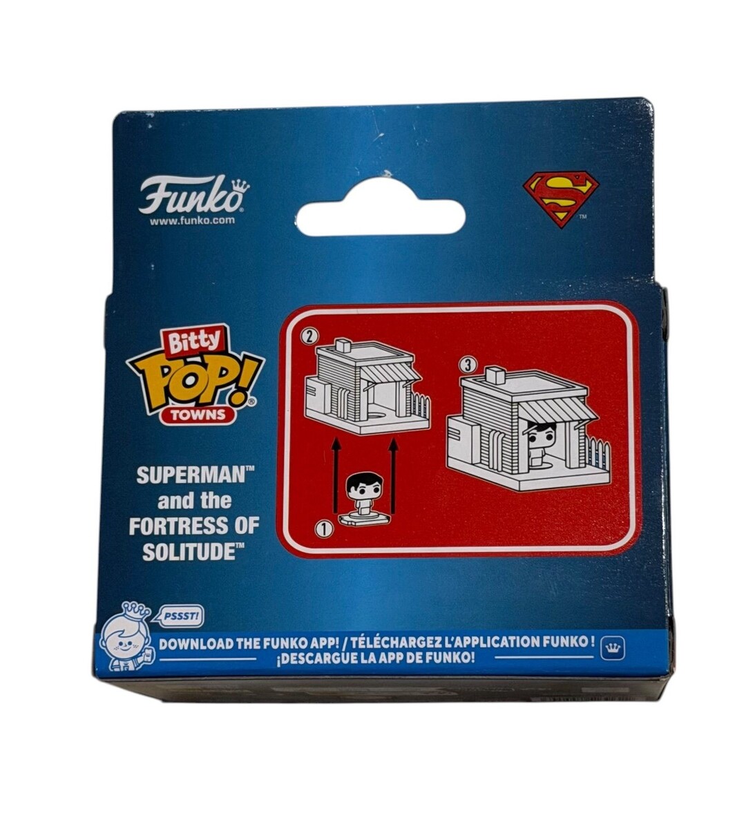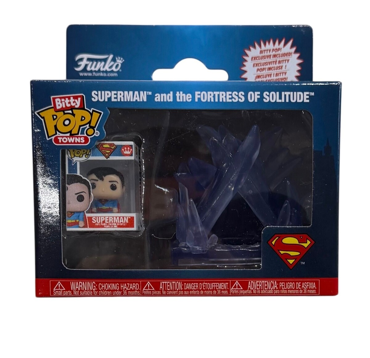 IN HAND Beautiful and Amazing Funko Bitty Pop Towns Superman and the Fortress of Solitude set. This Super Mini collectible features Superman alongside the iconic crystal Fortress display, including the exclusive Bitty Pop figure inside. Crisp DC branding with bold display presence makes this a standout piece for collectors of Superman, DC Comics, and Funko Towns series. Packaging shows light shelf wear but remains sealed and display ready. Perfect for adding a unique and visually striking piece to any collection.