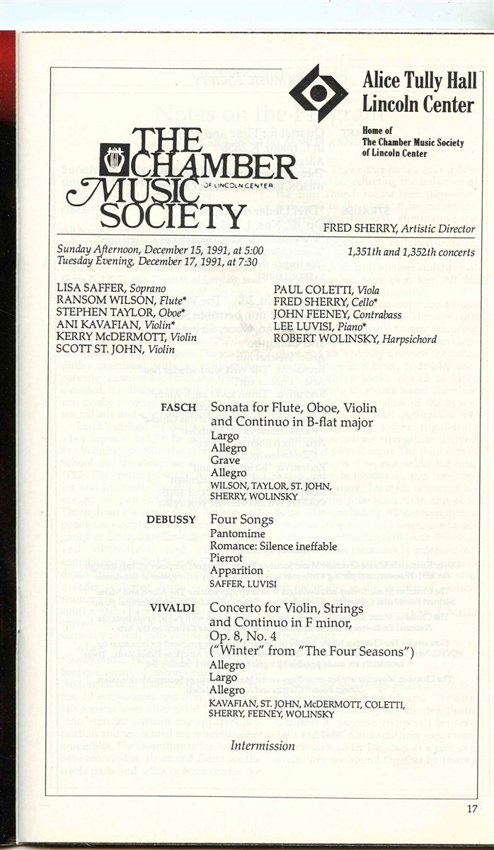 Stagebill Chamber Music Society Alice Tully Hall Lincoln Center New York 1991