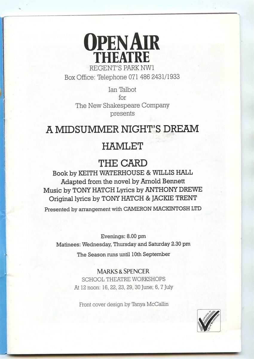 Open Air Theatre Program from Regents Park. The New Shakespeare Company presents: Midsummer Nights Dream , Hamlet and The Card.. From the 1994 Season. With synopsis, cast and crew for each production.