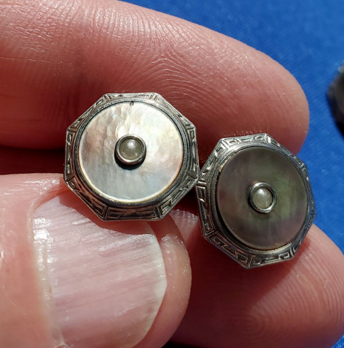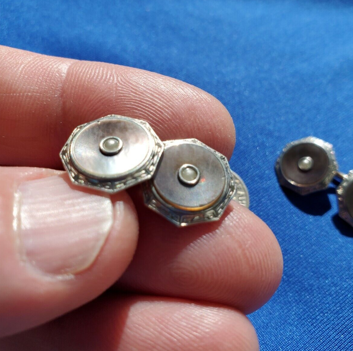 original VINTAGE KREMENTZ ART DECO ENGRAVED PEARL CUFF LINKS OCTAGON DESIGN