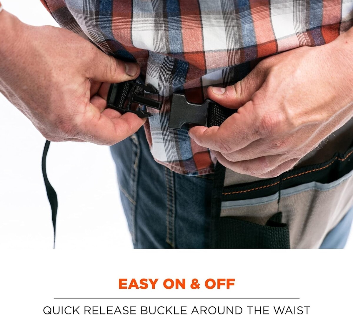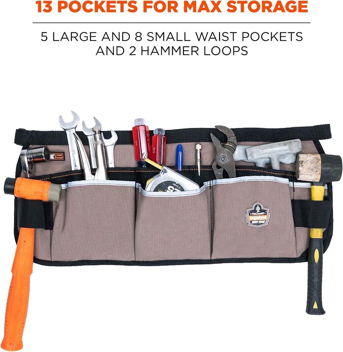 Versatility: Features 13 strategically placed pockets, including 5 large pockets for bigger tools or mobile phone and 8 smaller pockets for fasteners, pens, and other essentials.