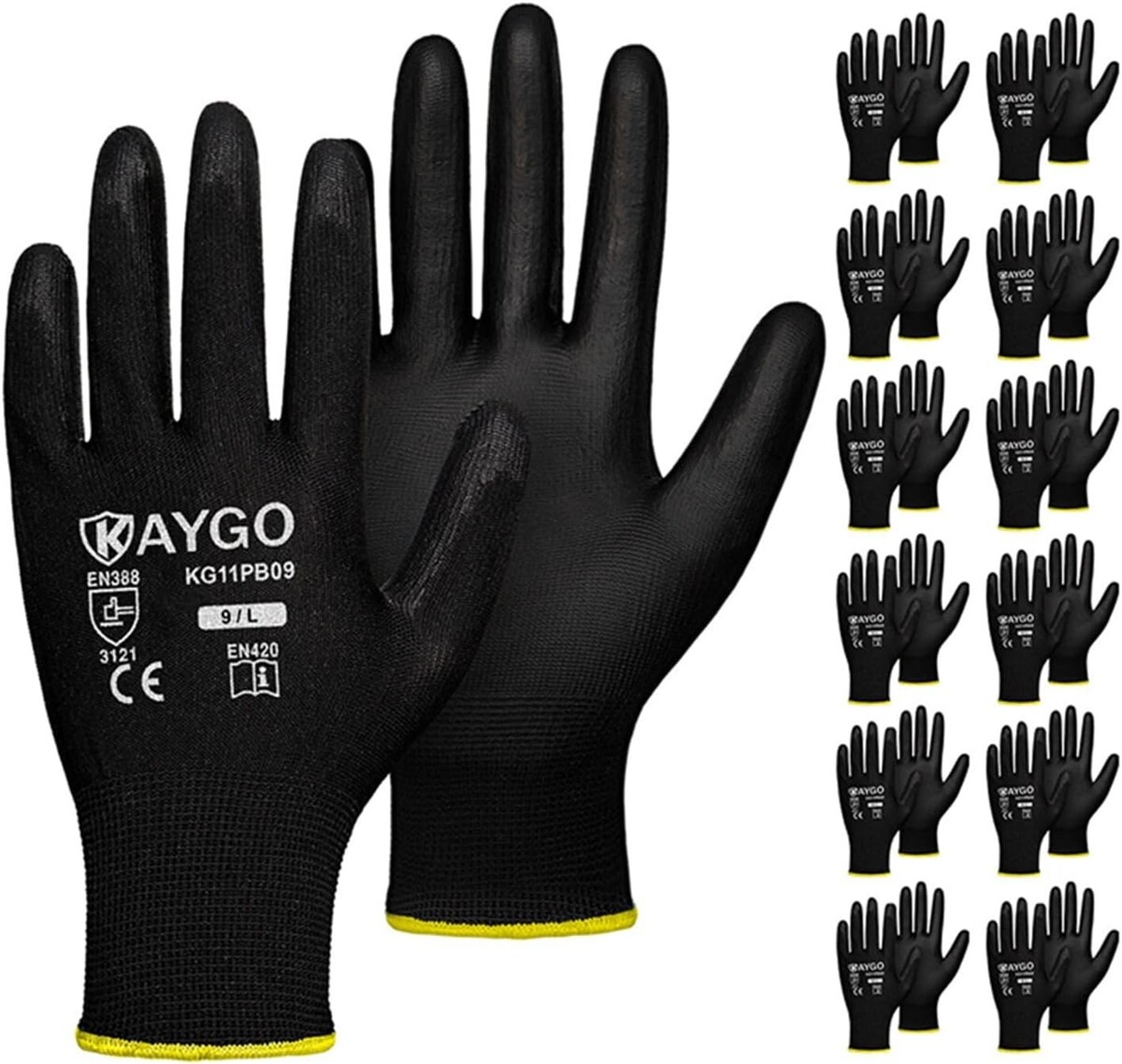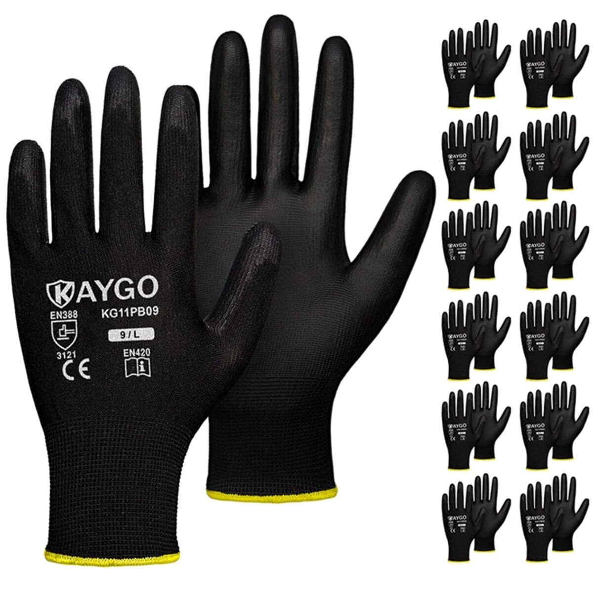 12 Pairs Black PU Coated Safety Work Gloves - Large, Ideal for General Duty