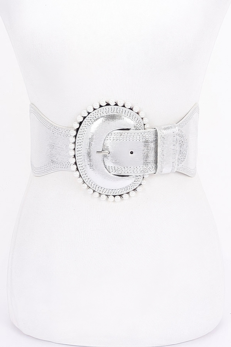 Design: Features a stunning metallic finish with a pearl accent, adding a touch of luxury to your outfit. The wide design enhances your silhouette, while the elastic material ensures a comfortable fit.