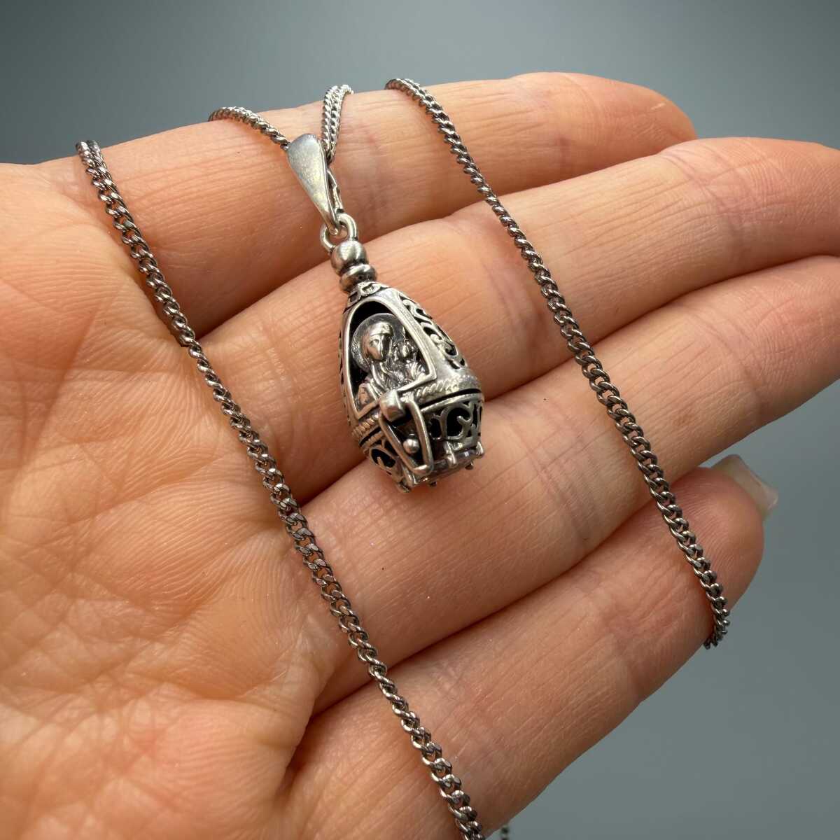 The pendant is designed in a locket-style form, adorned with intricate openwork details. At the front, it displays a finely crafted image of the Virgin Mary holding the Child, while the reverse side features a cross motif, adding symbolic depth to the piece. The pendant can be opened, giving it a distinctive and collectible character.