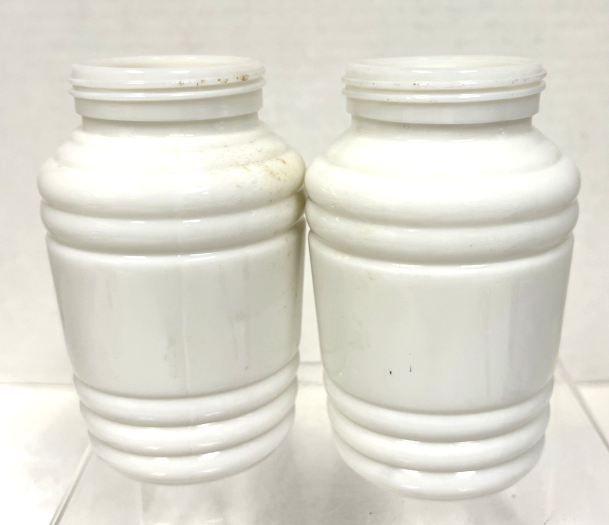 Vintage Hazel Atlas Milk Glass Beehive Shape Shakers No Lettering or Lids. No damage might need cleaning milk glass shakers assume made by Hazel Atlas same style shape no mark, no lettering as to salt pepper etc., shakers measure approx. 4 1/2" tall. See pictures.