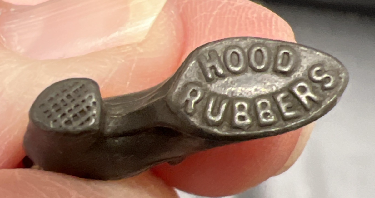 2 Vintage Metal Miniature Advertising Hood Rubbers Shoe Figural Charms 7/8" Long