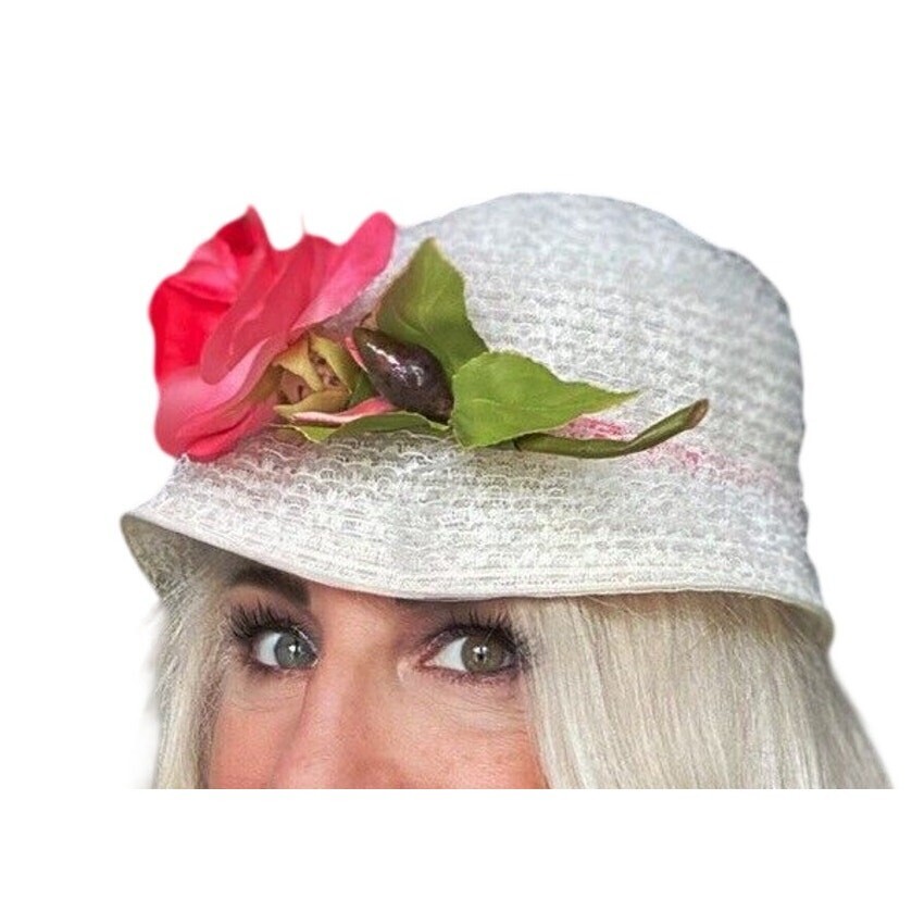 VTG 1950s James Campbell White Lace Garden Party Bucket Hat Pink Rose