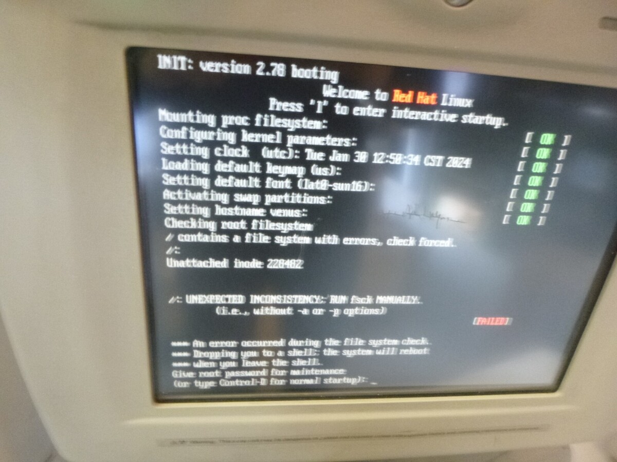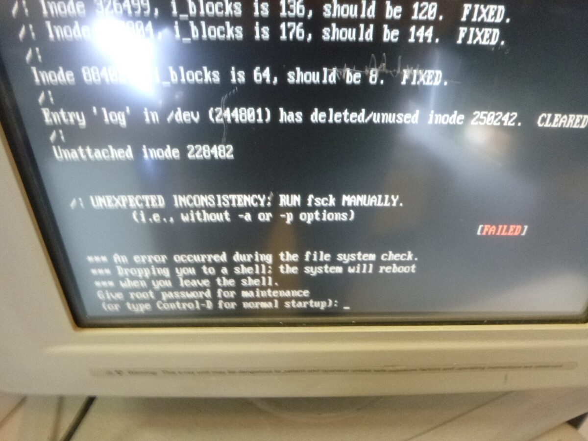 This unit powers on and it boots up as shown but eventually reads " UNEXPECTED INCONSISTENCY Type Control D for normal startup." When I type "Control D" it does the same thing and instructs to type control D again. This is as far as I have been able to test this and I am offering it AS-IS for part or repair.